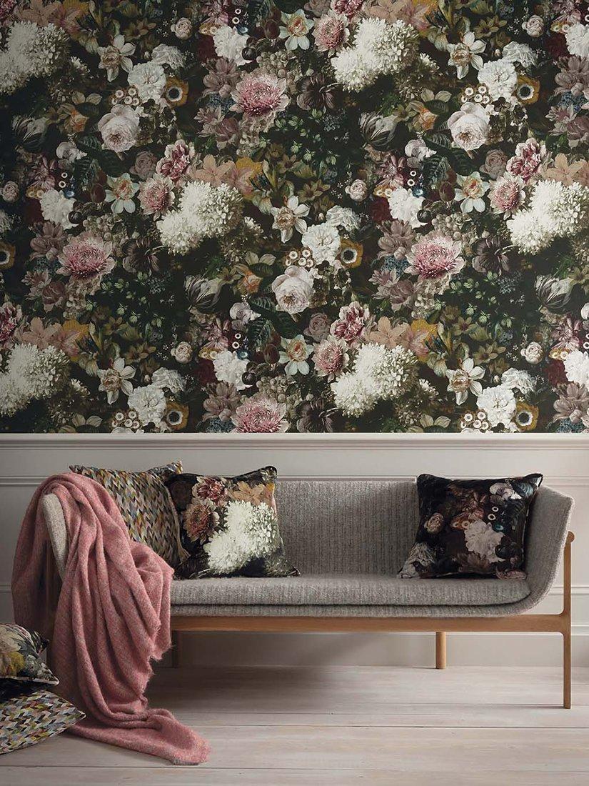 An all-over design of garden flowers, featuring chrysanthemums, peonies, anemones, tiger tulips and violets.