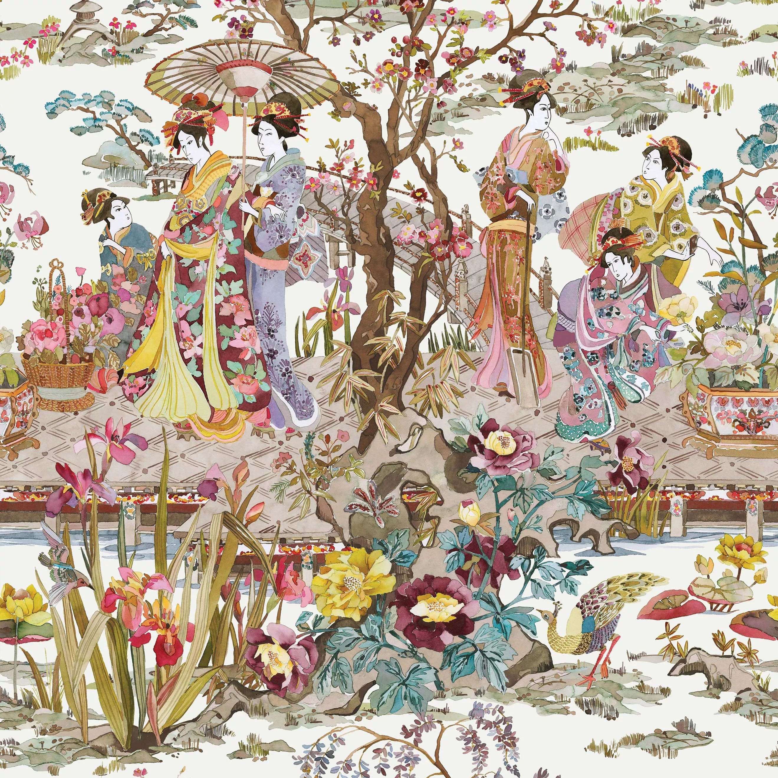A scene in the classic Japonais style, of kimono-clad ladies by an ornamental brook, is coloured in a fresh, contemporary manner.