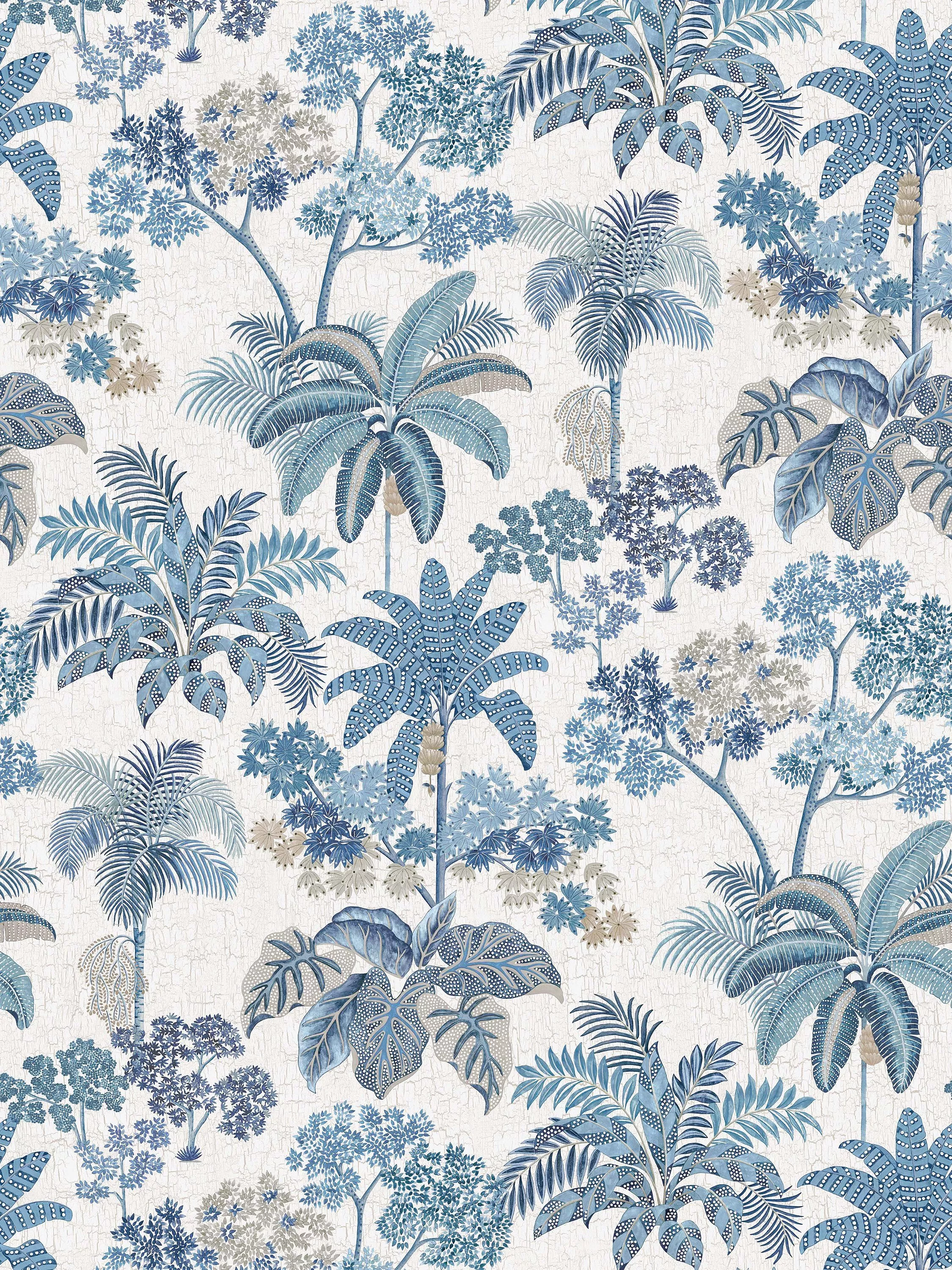 A beautiful garden landscape of elegant trees, banana palms and date palms. The design has been painted on craquelure ground, reminiscent of old fresco walls.