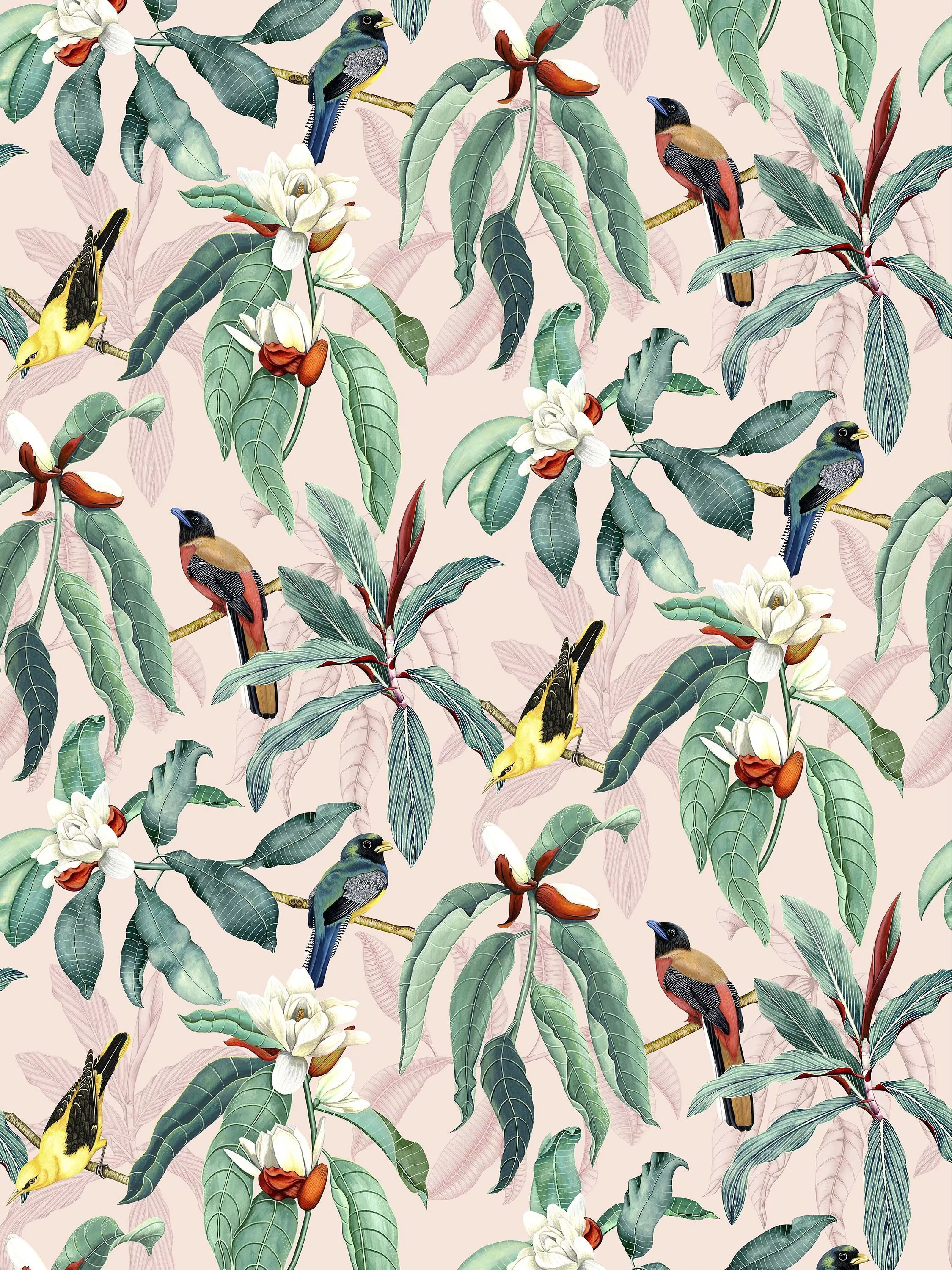 Exotic birds sit in the branches of a magnolia tree with budding flowers. The design is painted in watercolour, with pencil-drawn leaves in the background shadowing the foliage.