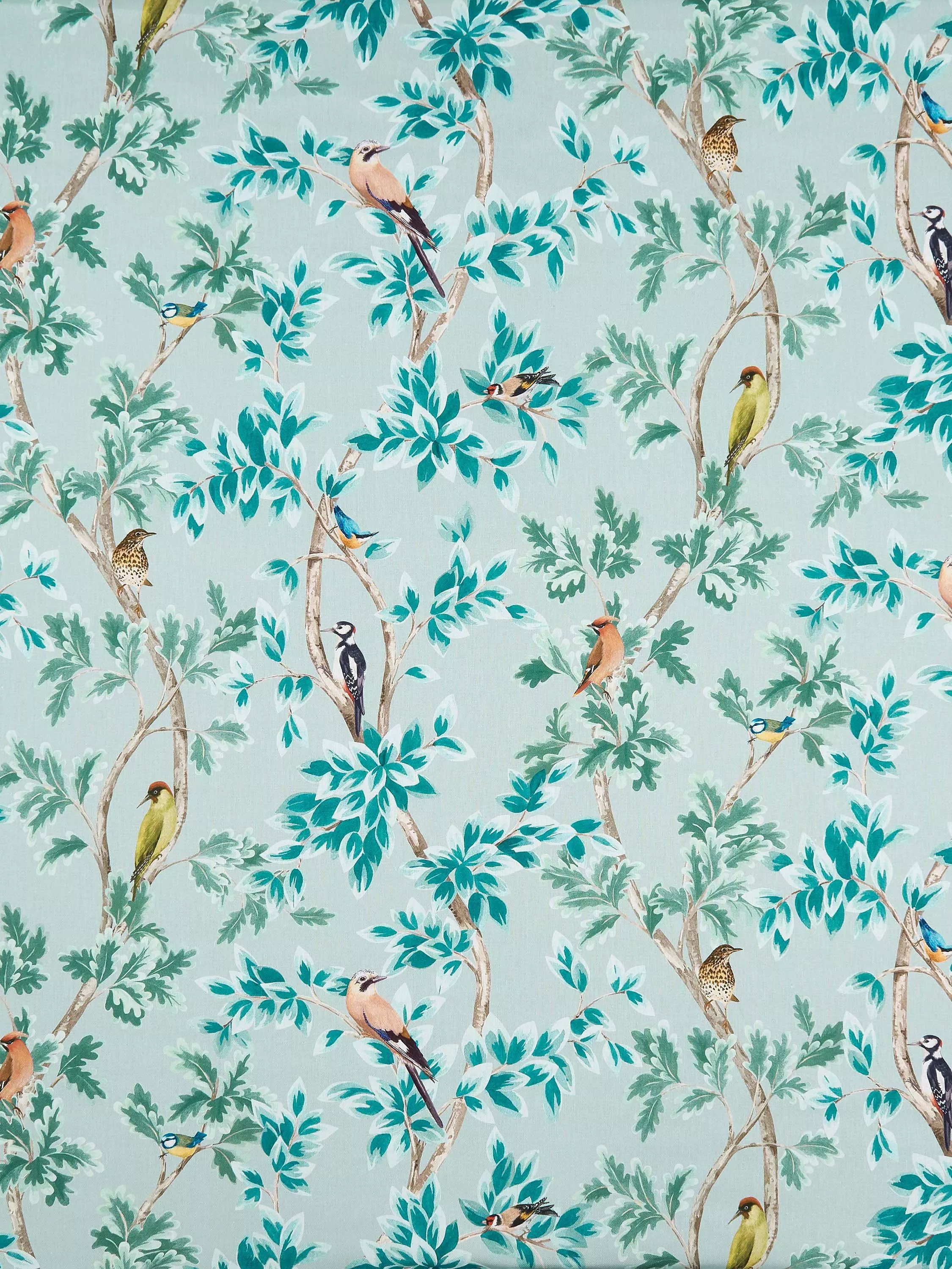 Woodpeckers, jays, blue-tits and other garden birds, perch within the leafy branches of two trees. The hand-painted design is digitally printed on a linen union twill ground.