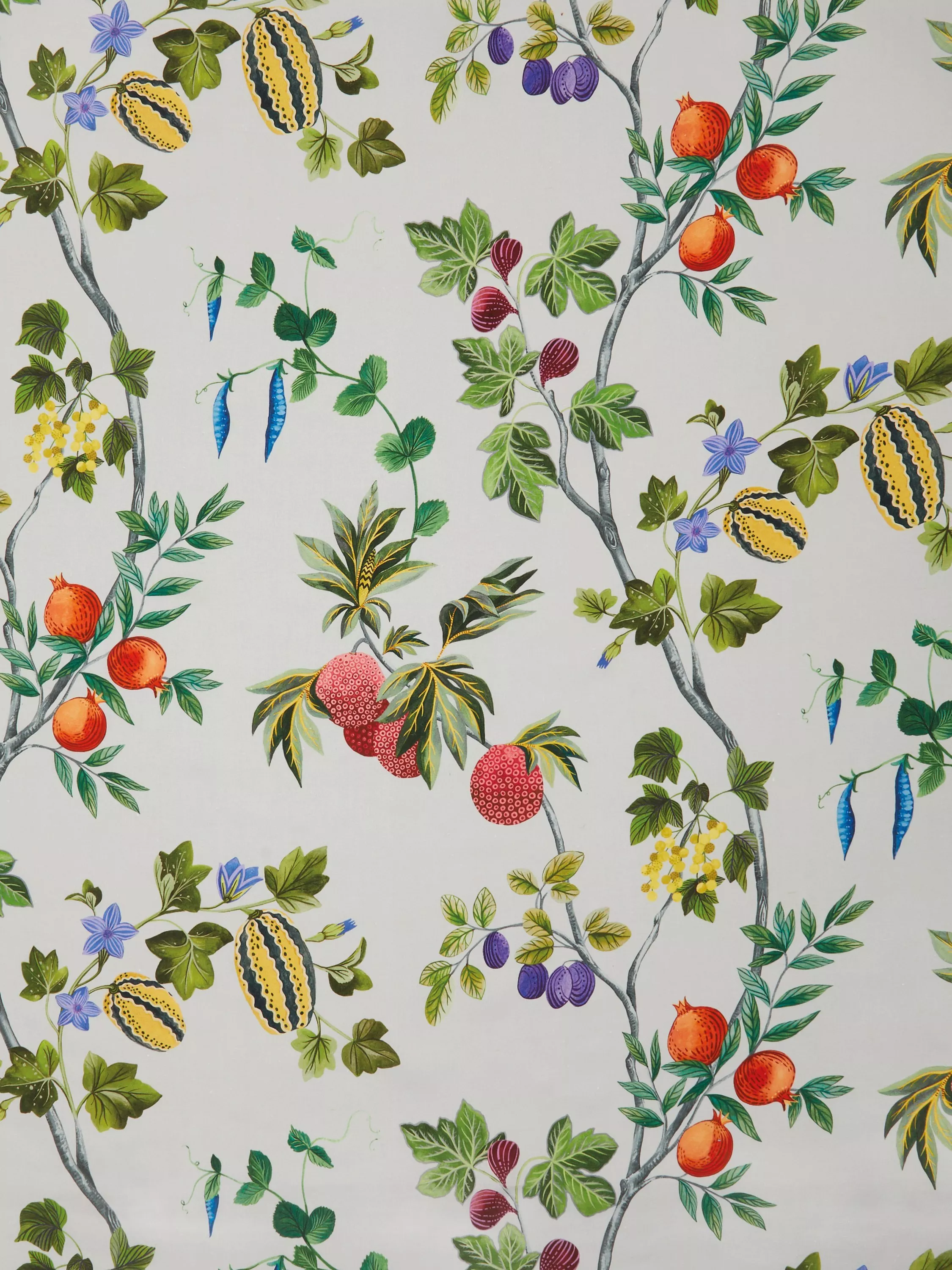 Printed on a pure cotton ground this fabric features a medley of fruits; pomegranates, figs, redcurrants, plums, breadfruits, melons and sweet pea pods are all arranged in a colourful trailing design.