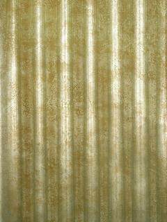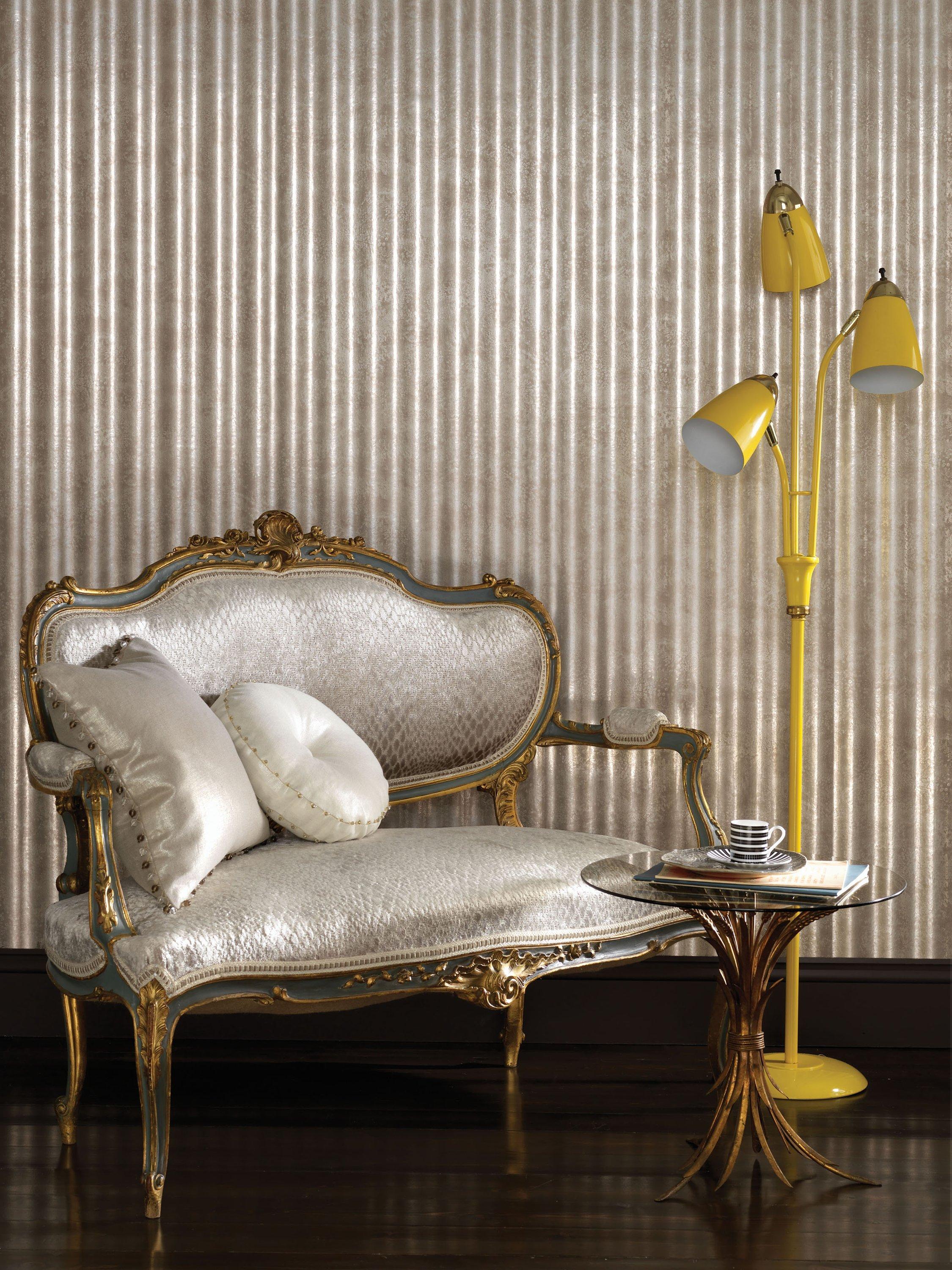 Printed on a holographic surface, this wallpaper resembles panels of antiqued precious metals.