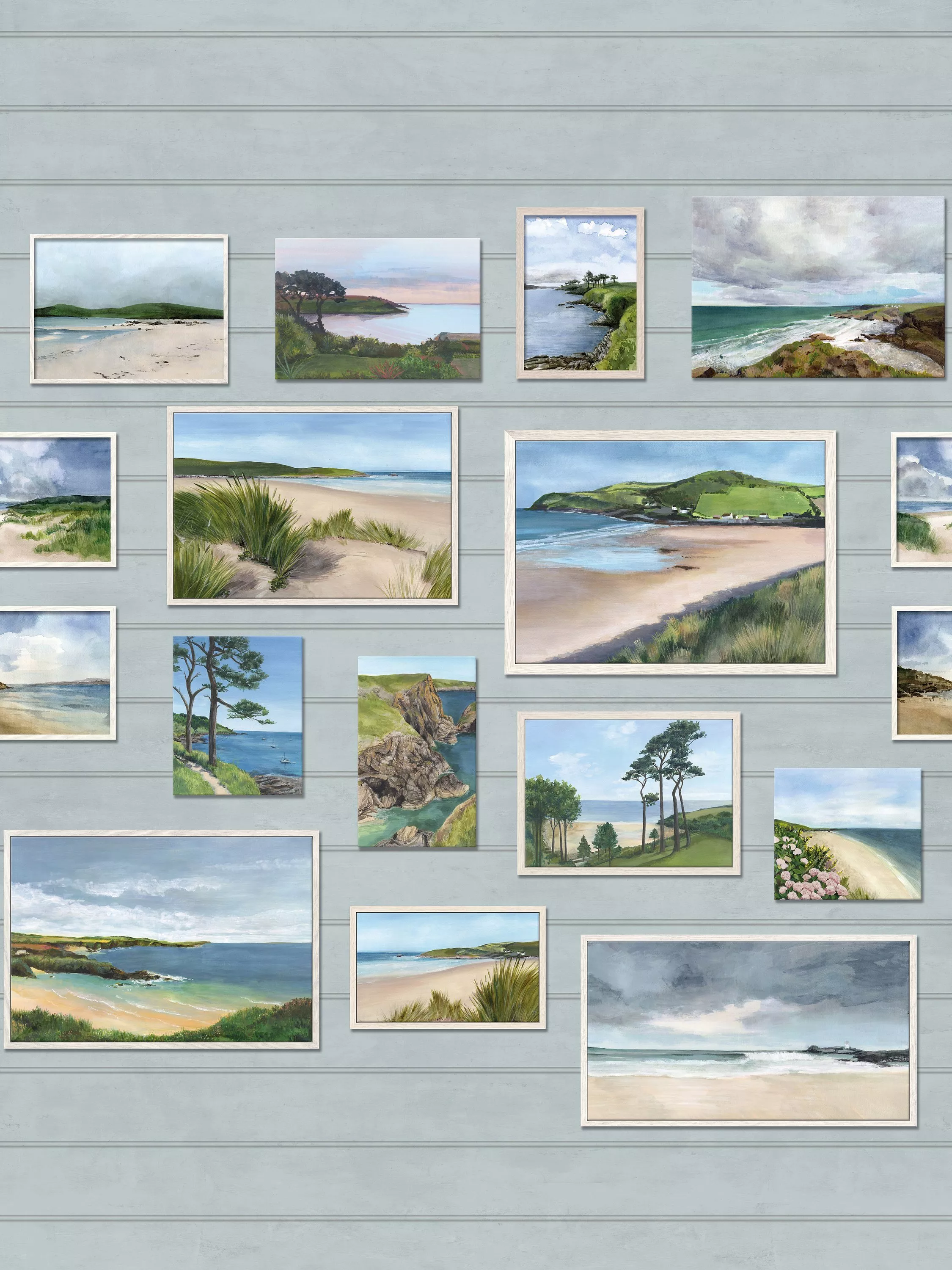 Watercolour seascape paintings are displayed on a painted, wood-panelled wall.