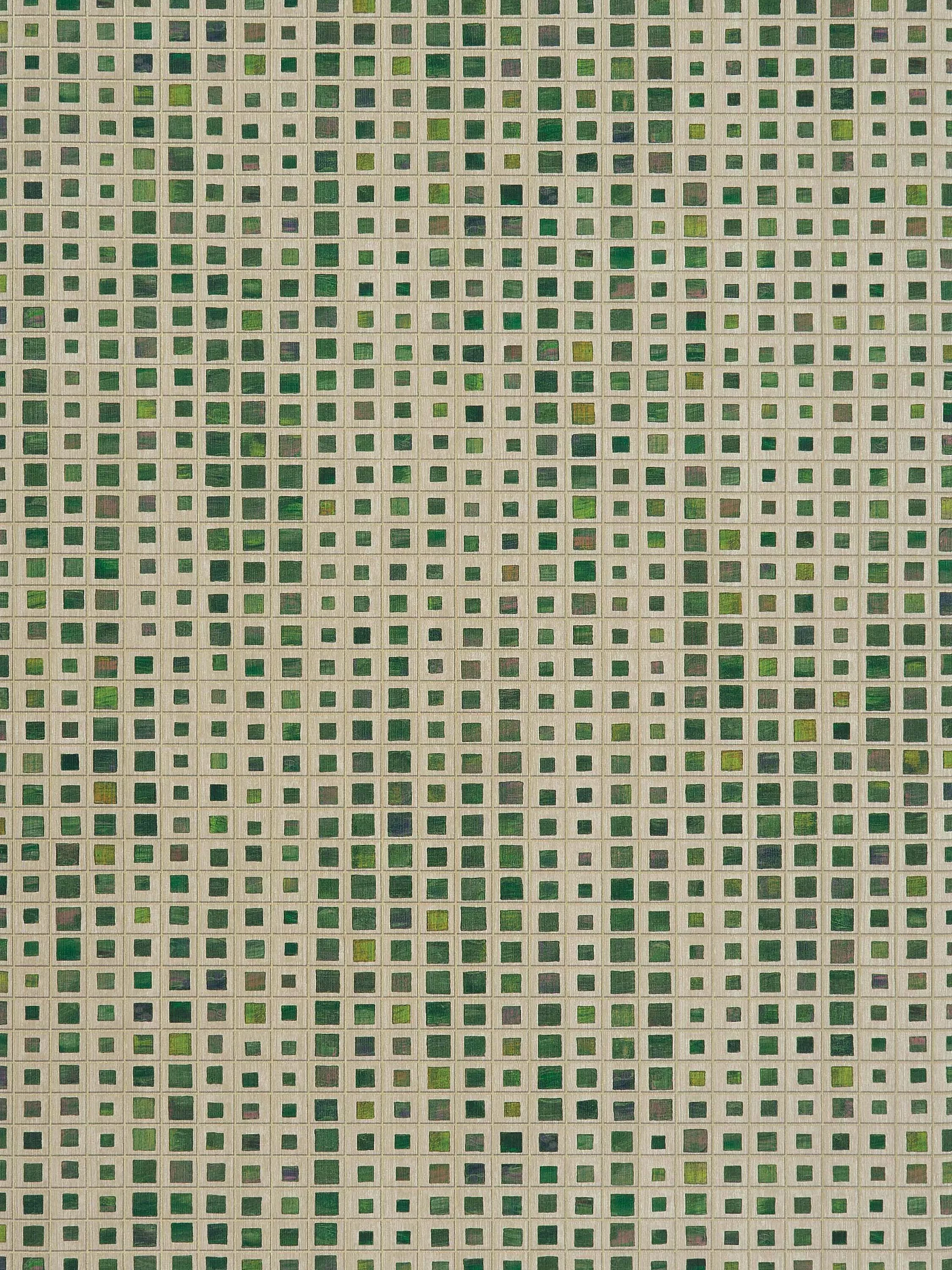 A linear metallic grid houses painterly coloured squares, in varying sizes, creating an undulating pattern across the design. Printed and embossed with a vertical strié.