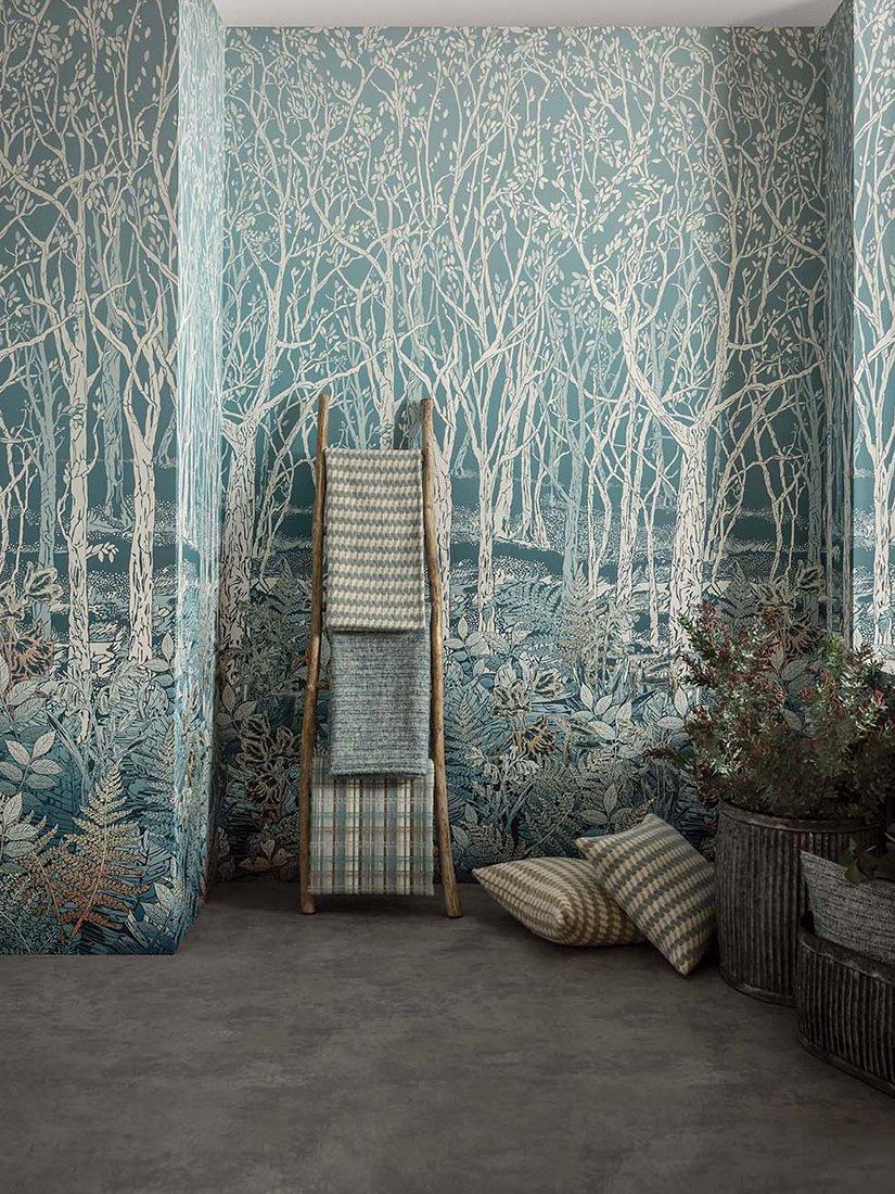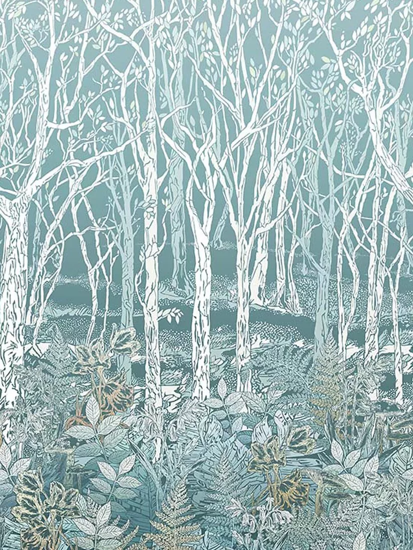 A whimsical woodland scene with a carpet of ferns, bluebells, wild tulips and toadstools is presented as a woodcut mural design with ombre colour throughout the trees, foliage and background. This wallcovering has been designed as three panels.