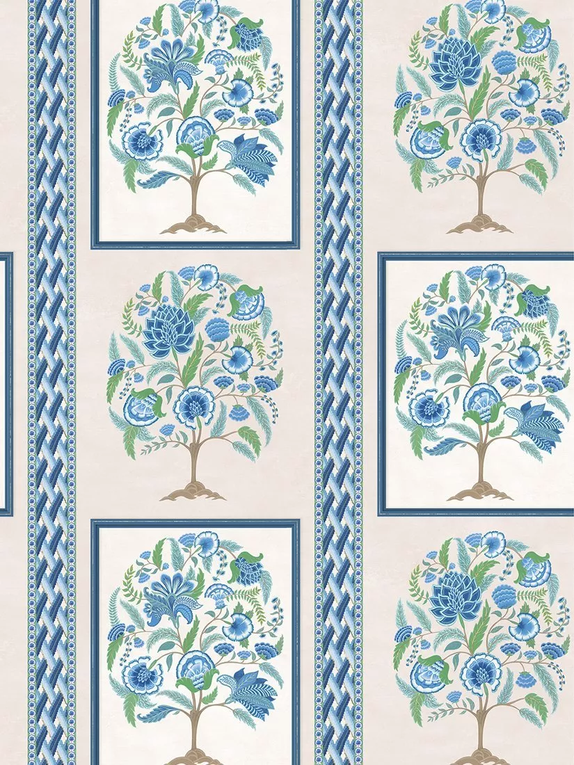 A contemporary tree-of-life design with paisley flowers presented within picture frames, adorned with gold inlay, all within a lattice border stripe.