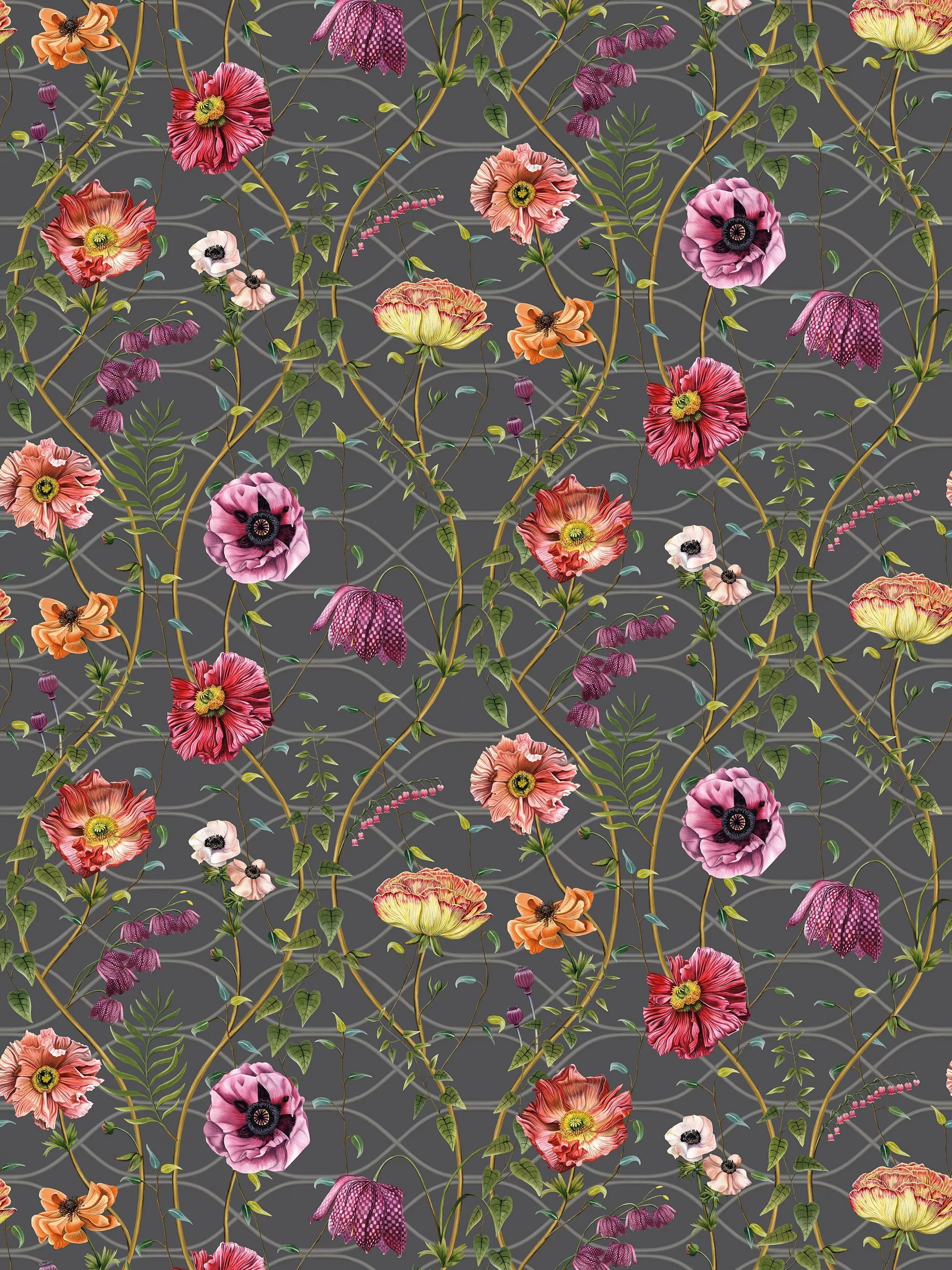 Elegant stems, floral blooms and creeping vines form a large-scale ogee pattern, with a trellis framework in the background.