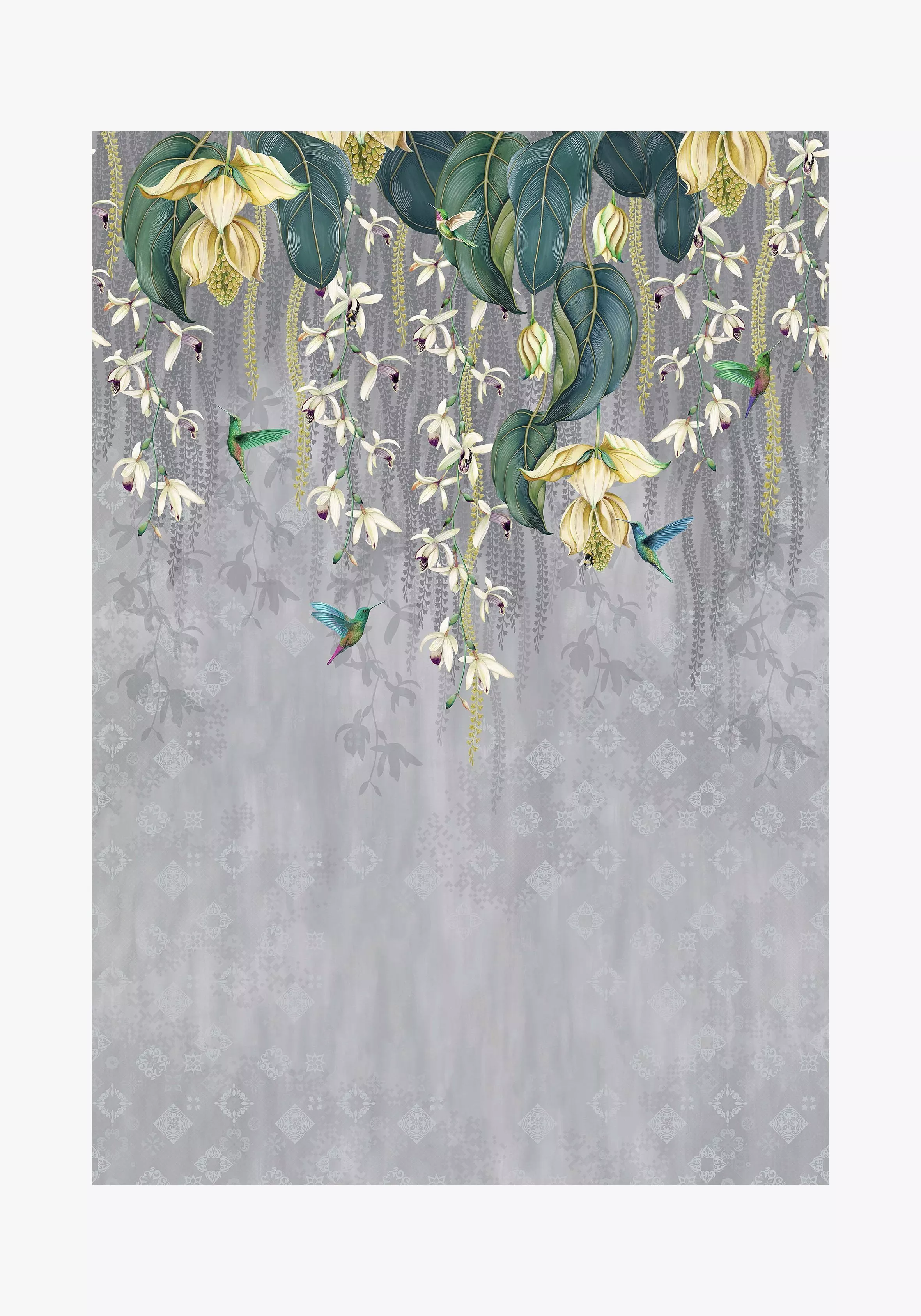 An Osborne & Little wallpaper featuring over-scaled orchids trailing downwards from the ceiling, with hummingbirds darting beneath them.
