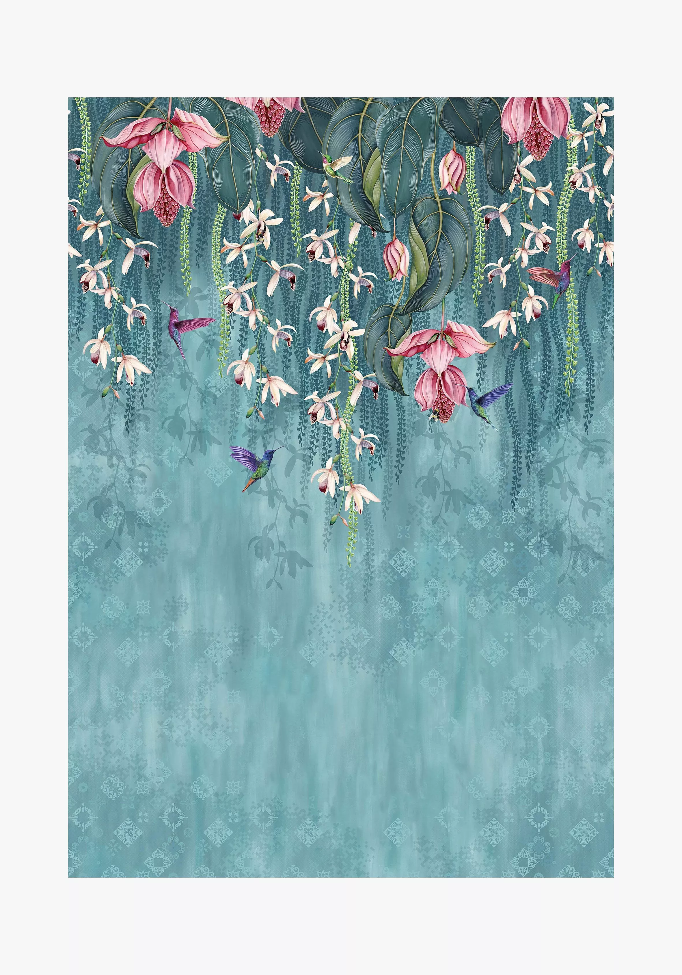 An Osborne & Little wallpaper featuring over-scaled orchids trailing downwards from the ceiling, with hummingbirds darting beneath them.