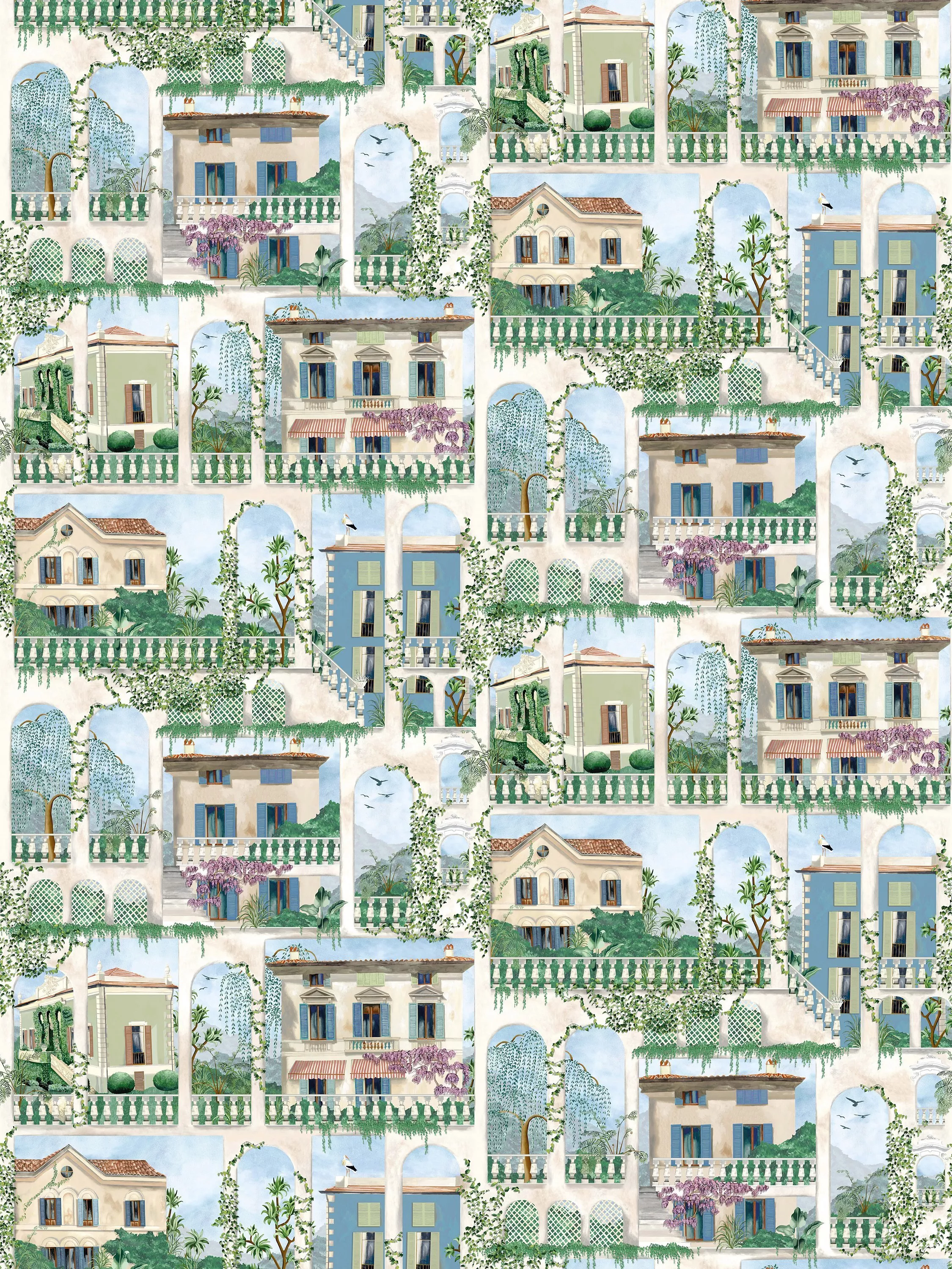 A repeating scene of traditional lakeside villas, with stone colonnades adorned with foliage and climbing wisteria, is set against a hillside backdrop, inspired by the beautiful lakes of Northern Italy.