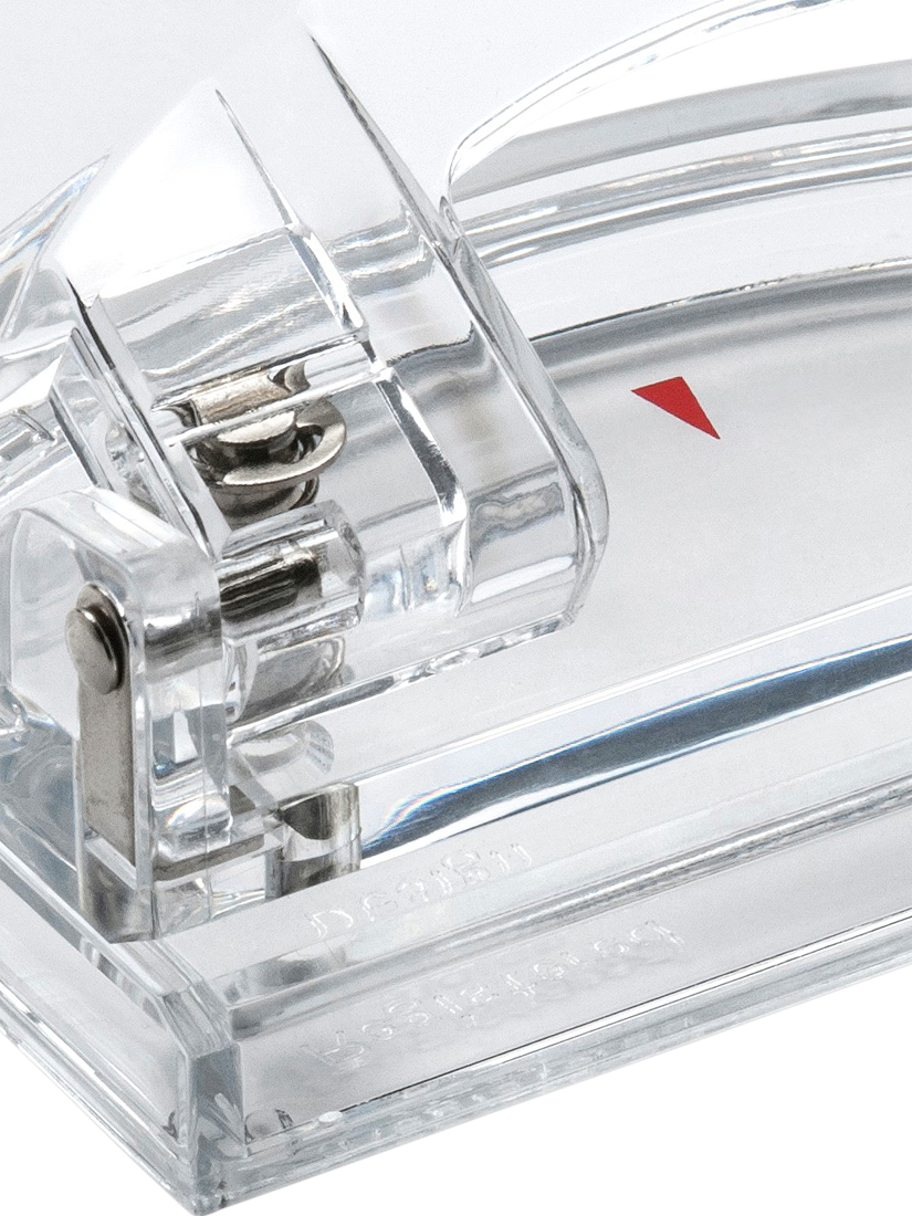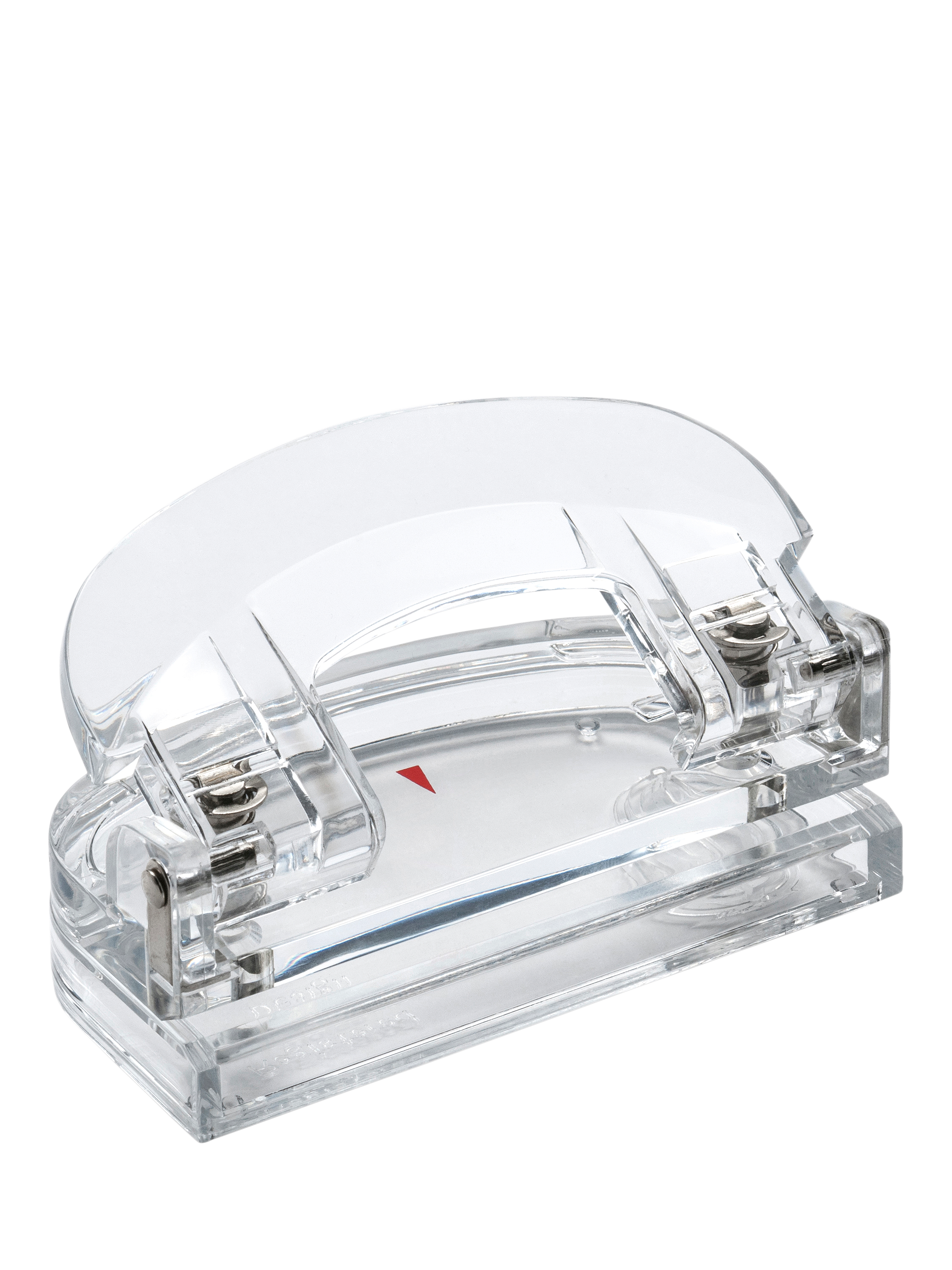 The elegant, stylish OSCO Acrylic two-hole punch has a 12-sheet capacity. There is an 80mm hole space and an easy empty confetti tray.