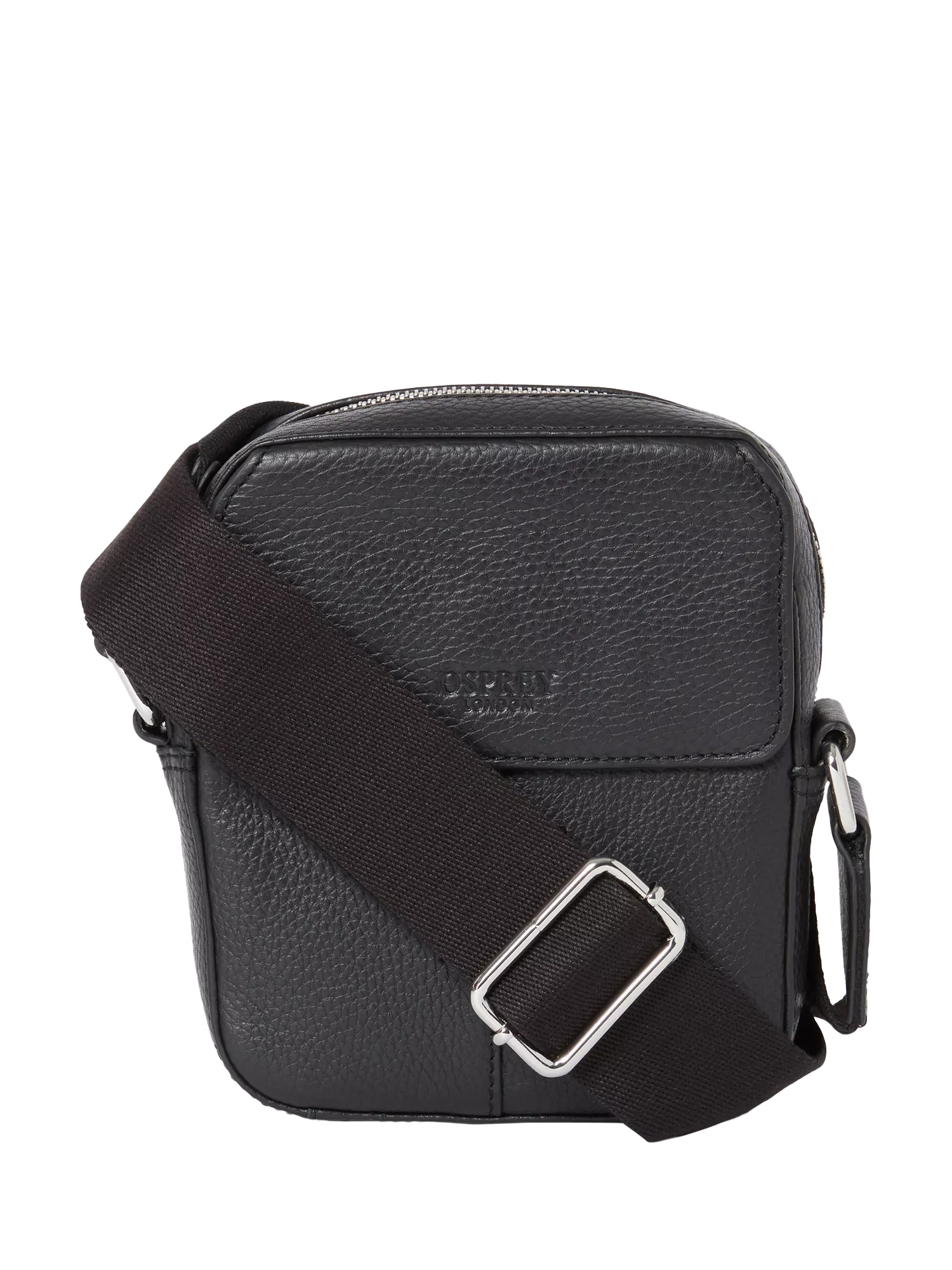 It features a front slip pocket with a fold-over flap closure, secured by two magnetic dots, a top zip closure with a leather pull, and silver metal hardware throughout. The fold-over flap showcases the Osprey London logo, blind embossed for a subtle finish. An adjustable webbing crossbody strap ensures a comfortable, stylish fit. It's lined in signature Osprey London jacquard fabric in a co-ordinating colourn. The interior includes three card slots, a leather trimmed slip pocket on one side and a leather trimmed nylon zip pocket with a keyring attachment for added convenience on the other.