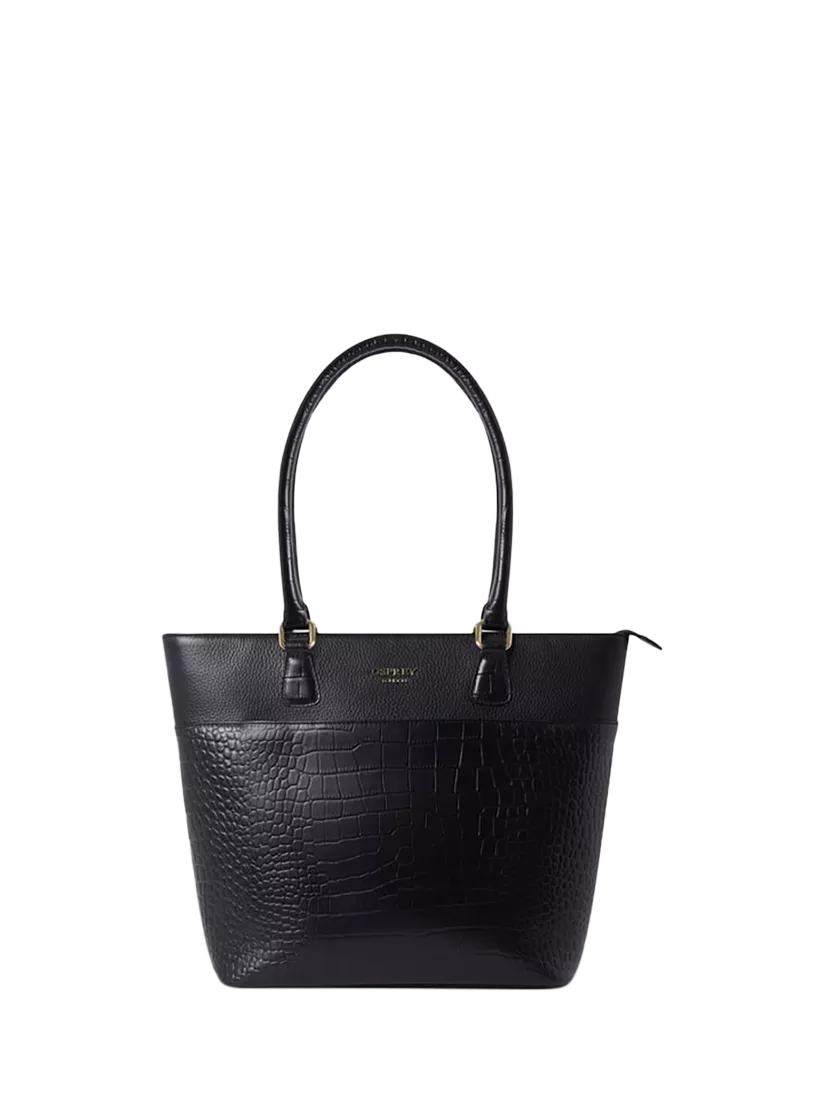 Crafted with meticulous care and precision, the OSPREY LONDON Kellie Tote bag epitomises timeless elegance and functional luxury. The polished croc leather panel on the front of the bag houses a fullwidth zipped pocket with a gold OSPREY LONDON branded zip-pull. Long structured top handles and gold hardware throughout. The interior is lined in beige OSPREY LONDON jacquard fabric and opens via a gold zip pull. Fits up to a 13" laptop. Comes with a dust bag.