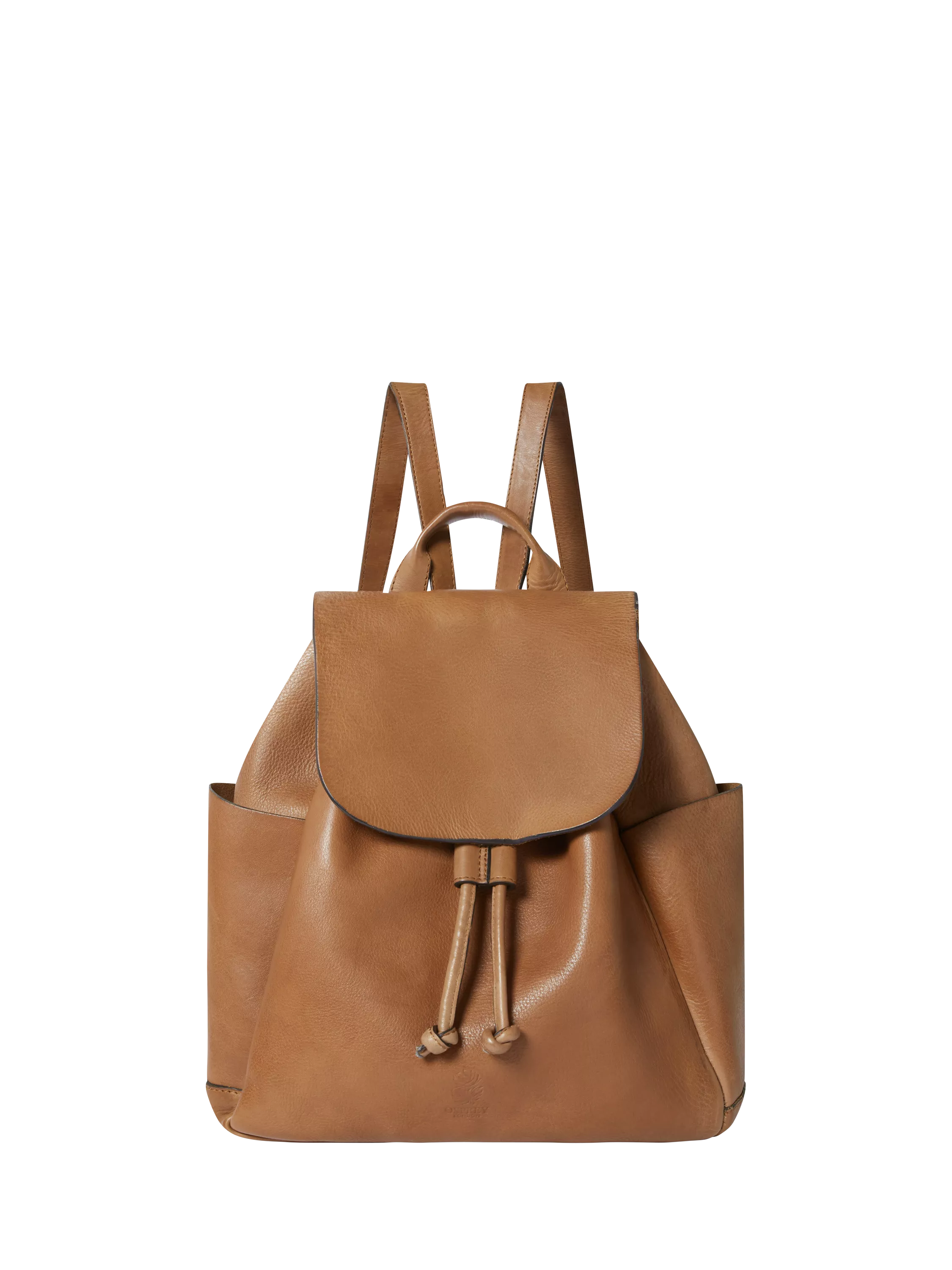 The bag features two soft side pockets for holding a bottle of water or a small umbrella. The unlined interior has a leather zip drop pocket, ideal for storing valuables. The bag has a leather drawstring fastening with antique brass eyelets and a fold-over flap that fastens with a magnetic dot for added security.
