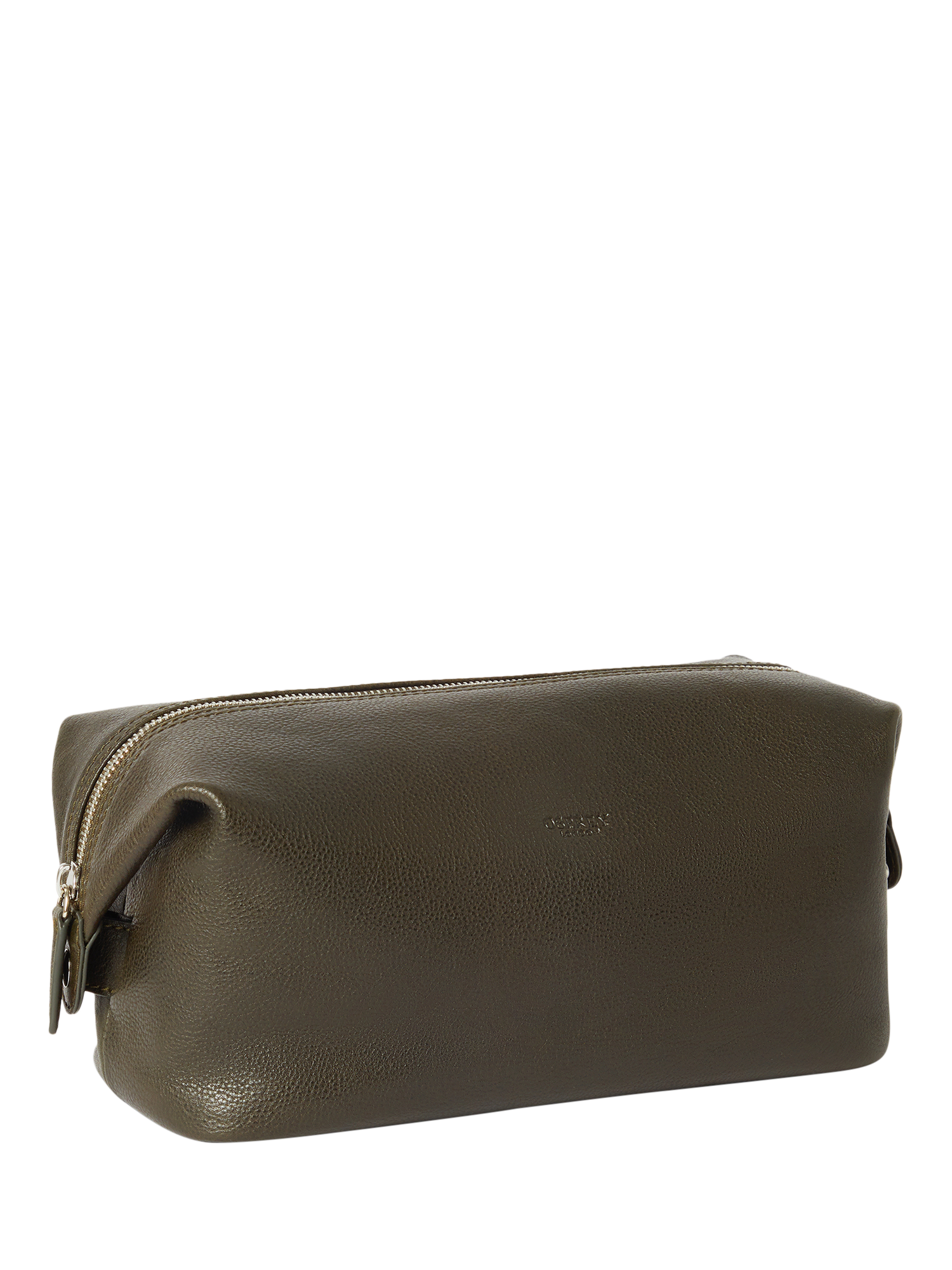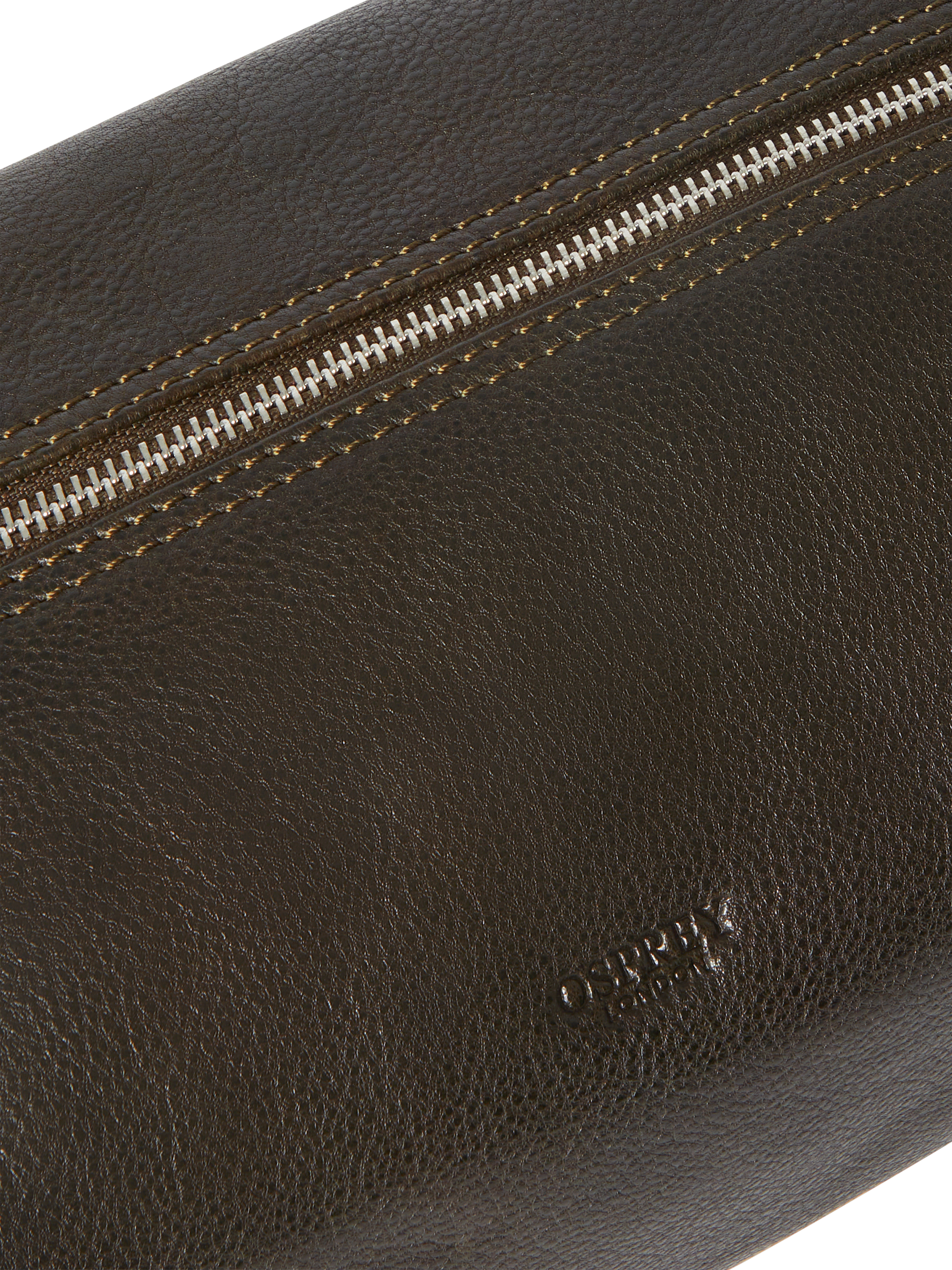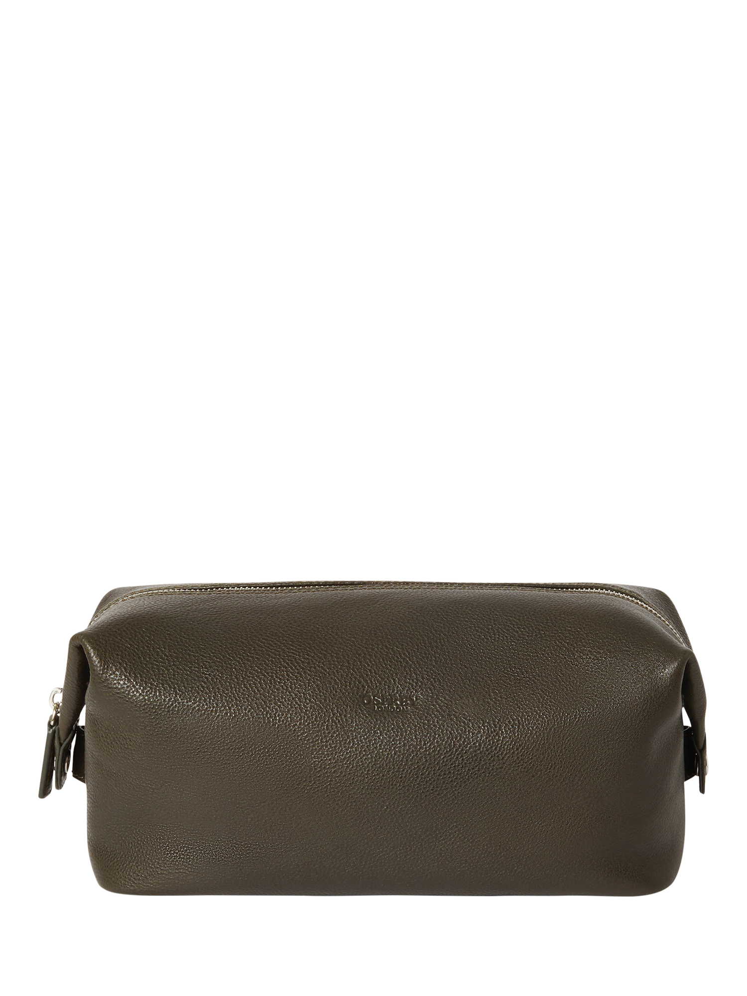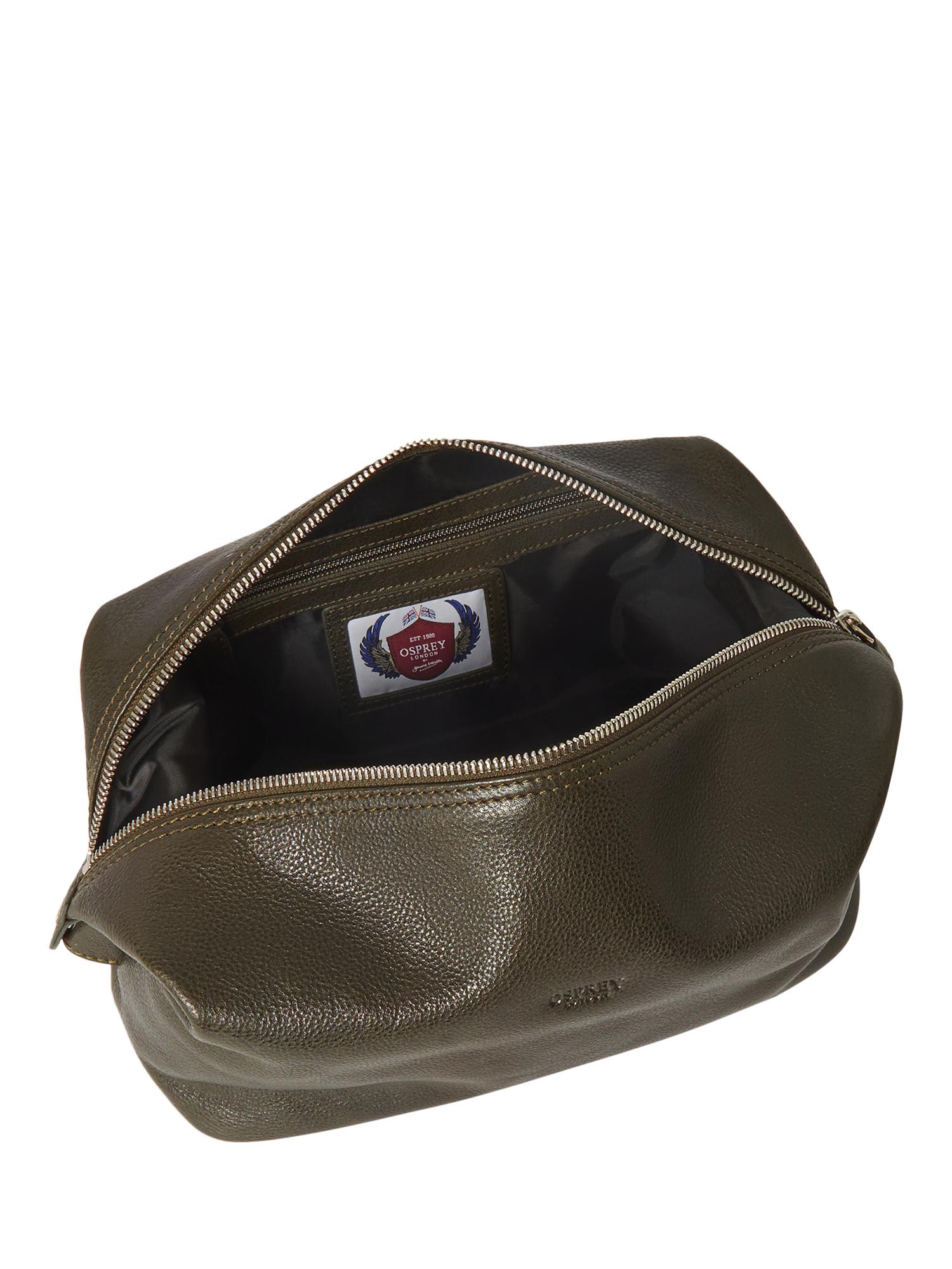 It features the Osprey London logo embossed on the front, silver metal hardware throughout, and a zip top closure with matching leather pull. The capacity of the washbag can be increased by unclipping the metal poppers on either side.