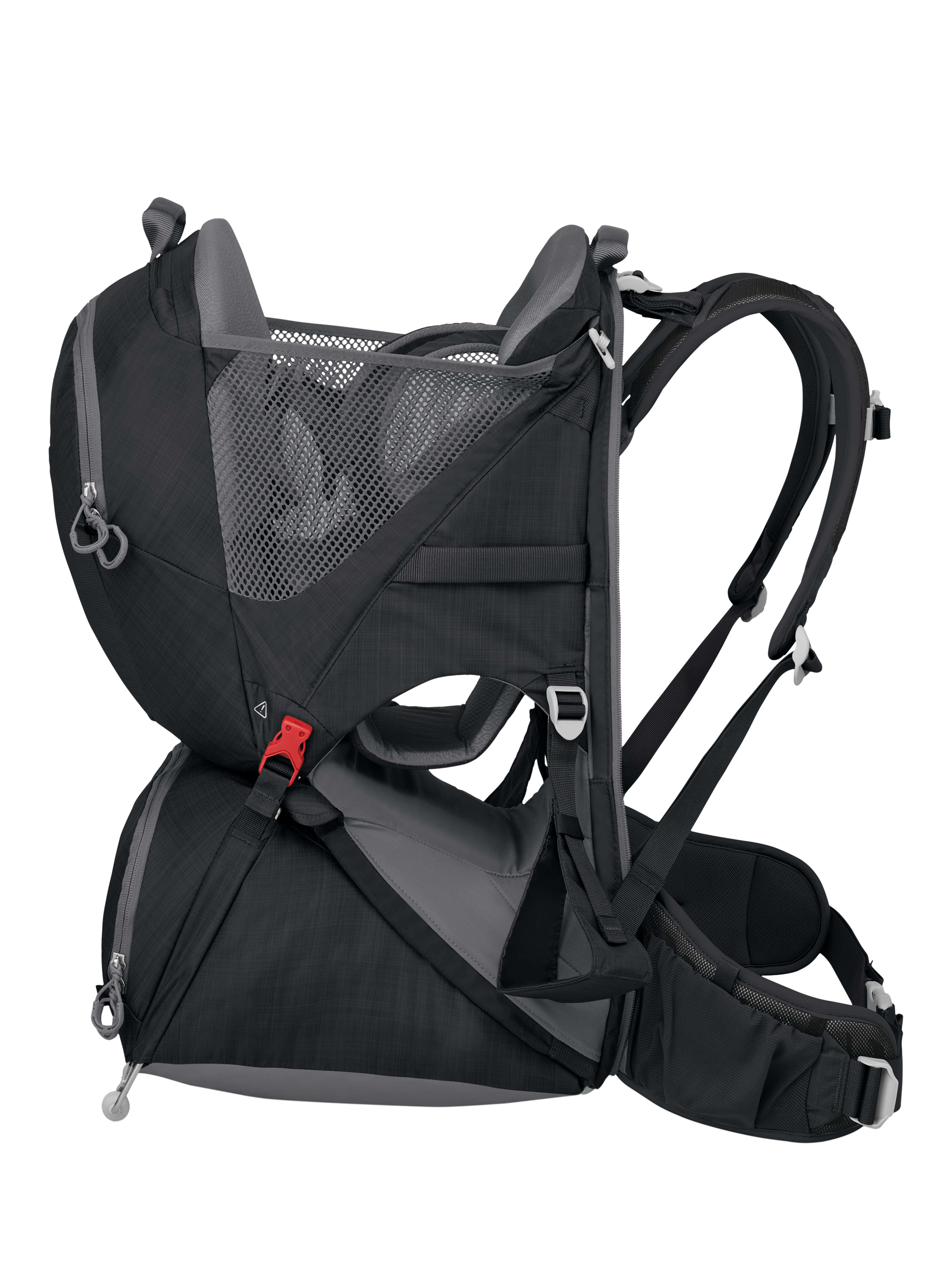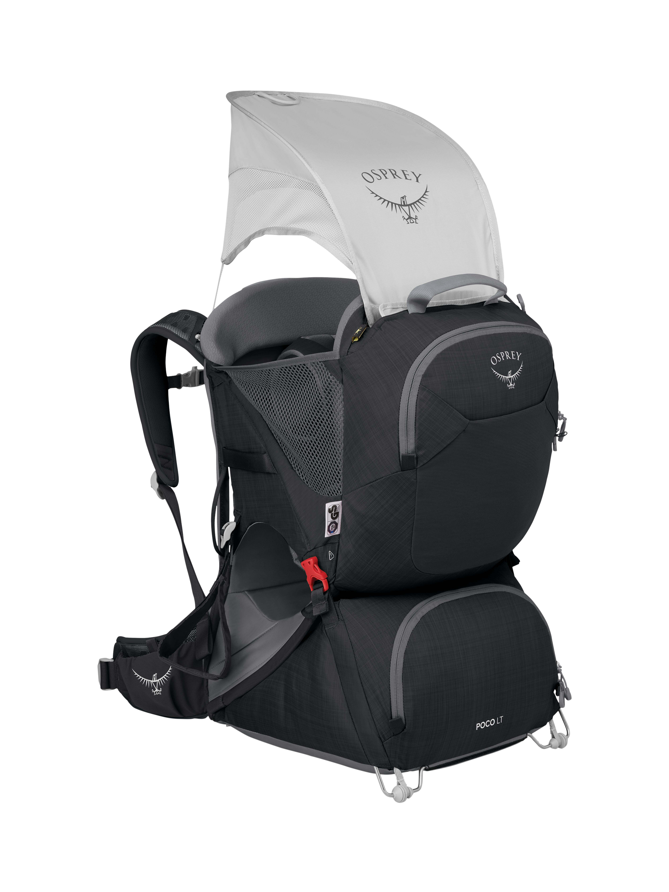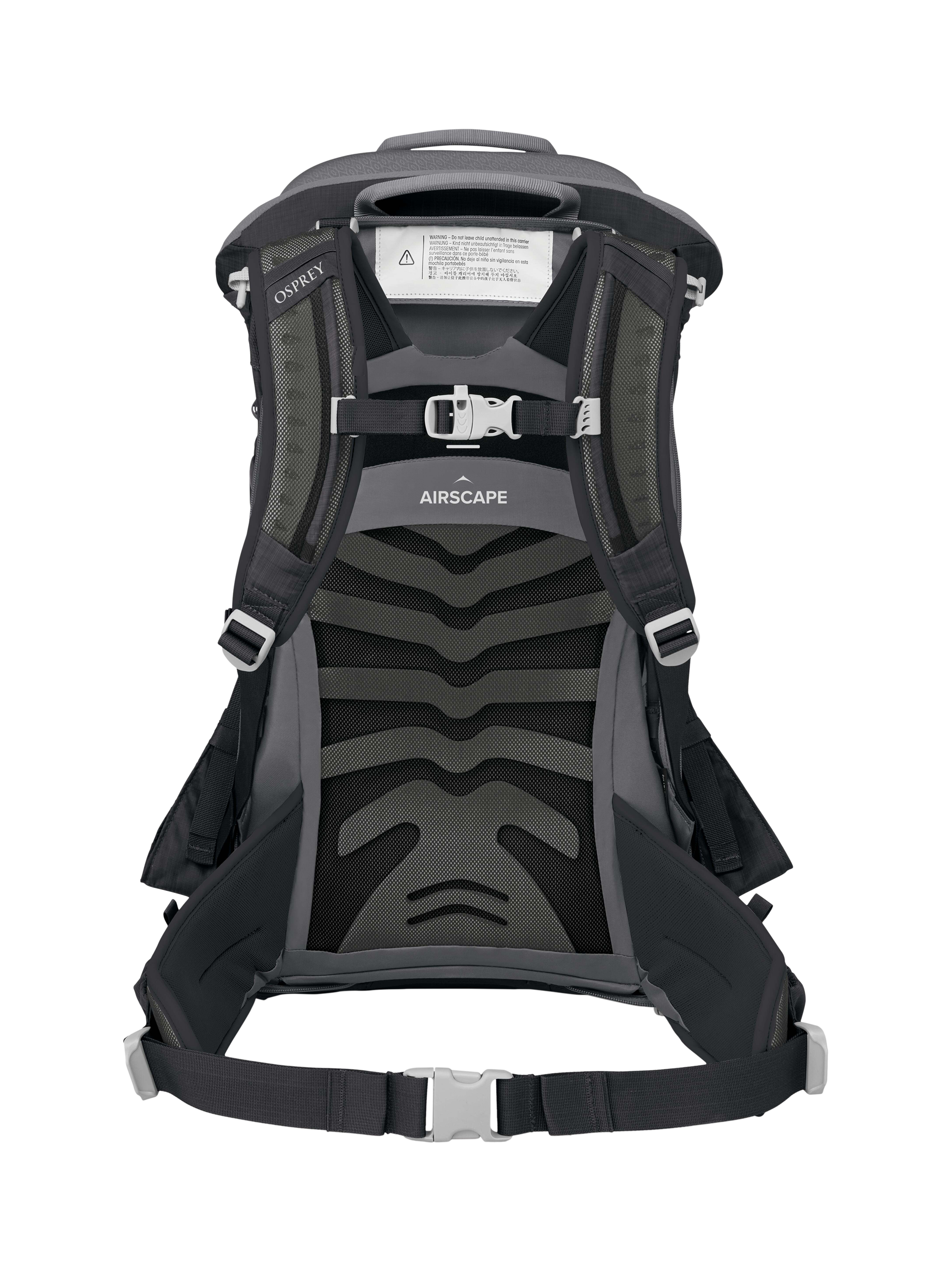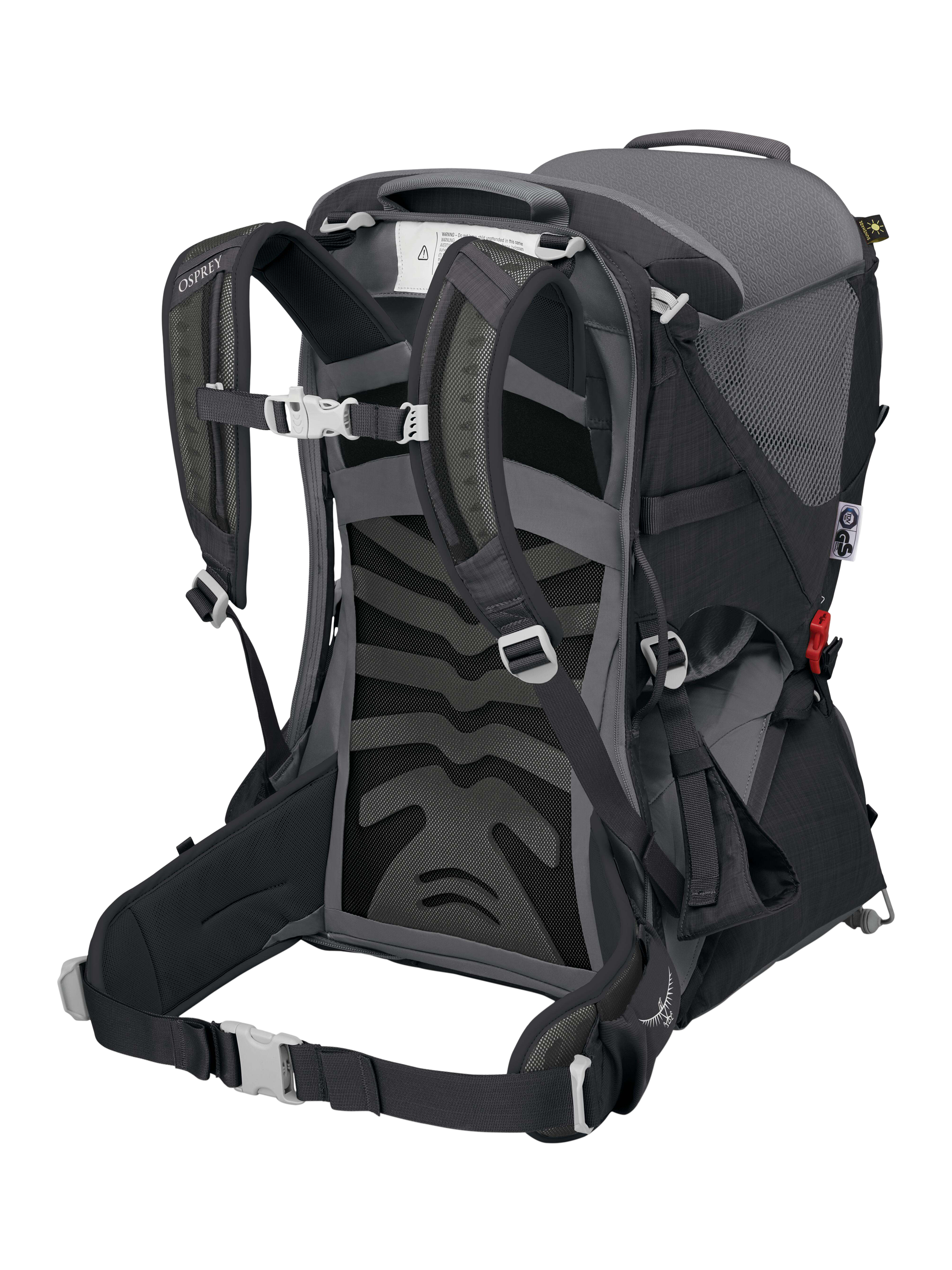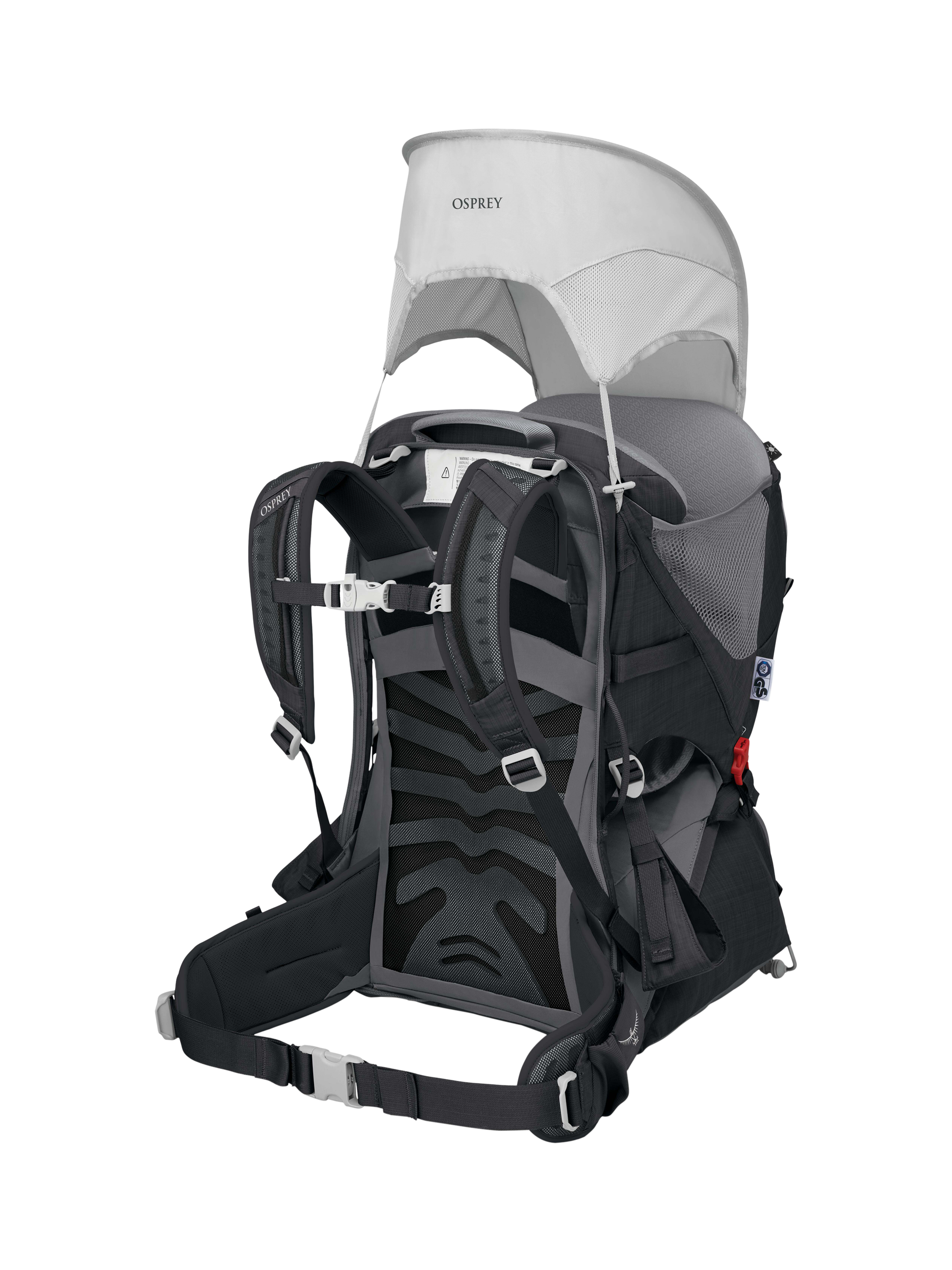 This lightweight child carrier is ideal for tight stores, busy sidewalks and shorter hikes. Osprey's patented lightweight frame folds flat for storage. Featuring ventilated AirScape™ suspension and adjustability to fit a variety of body shapes and a built-in UPF 50 sunshade.
