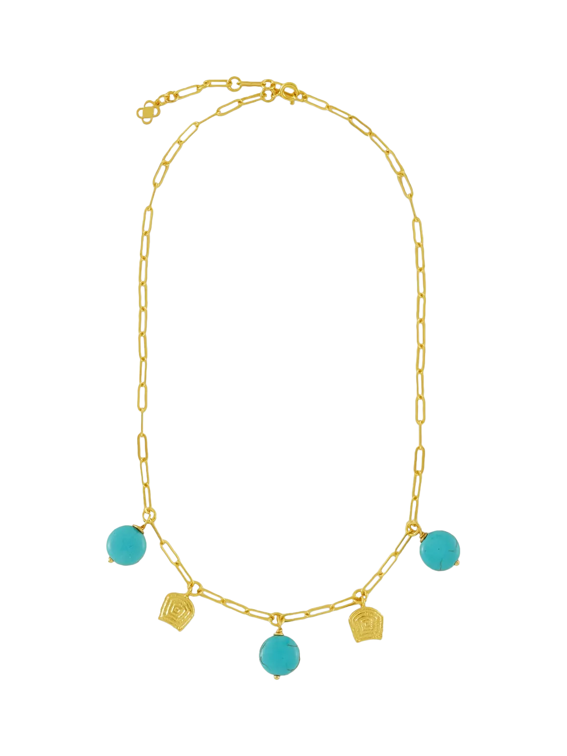 Make a statement with the Amore Turquoise Charm Chain Necklace, bringing the beauty of the sea to life with a stunning mix of semi-precious turquoise, and natural geometric golden charms. Crafted with care, this piece features a delicate chain accented with playful, beach-inspired elements. The vibrant turquoise and handmade 21ct gold-plated recycled brass mix create a fresh, coastal vibe that’s perfect for any occasion.