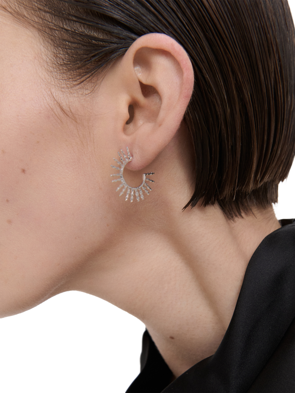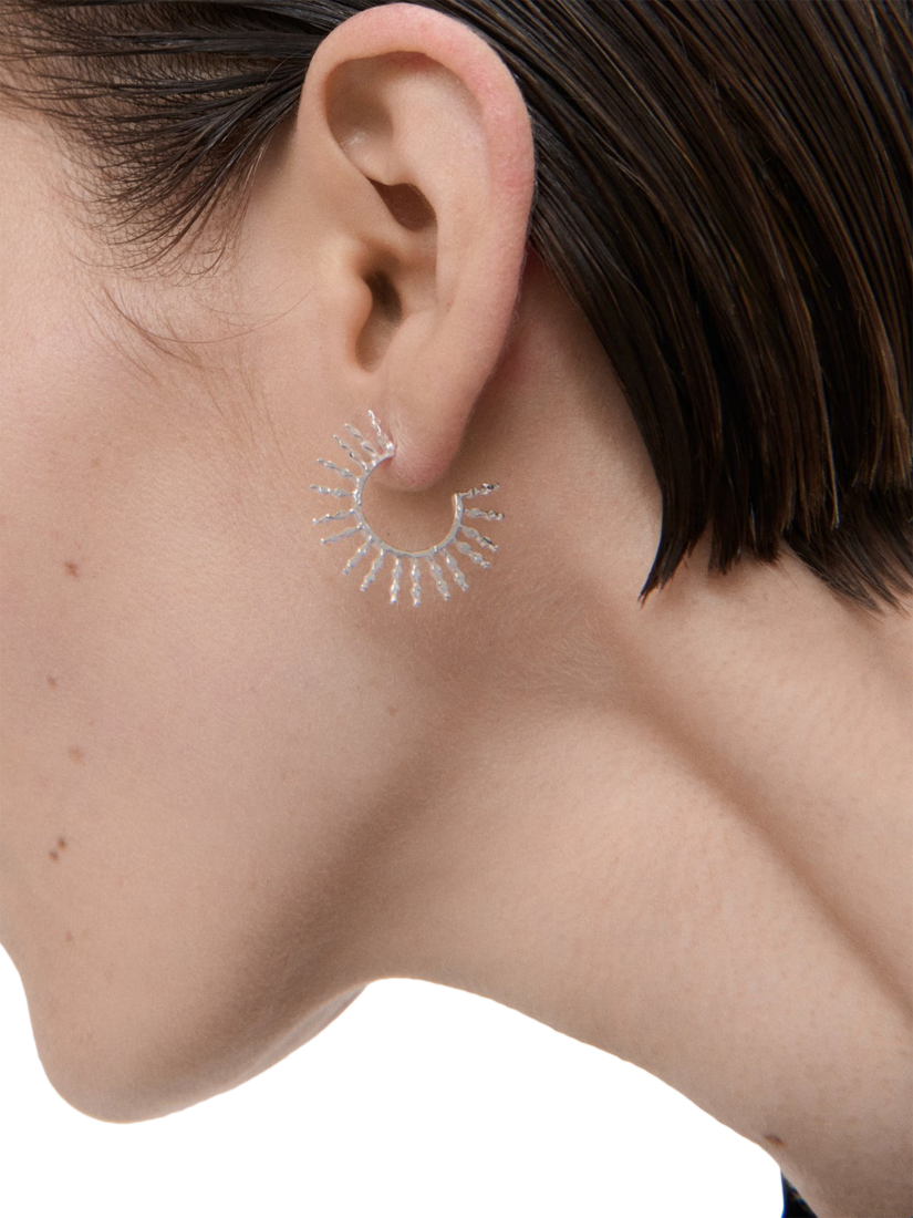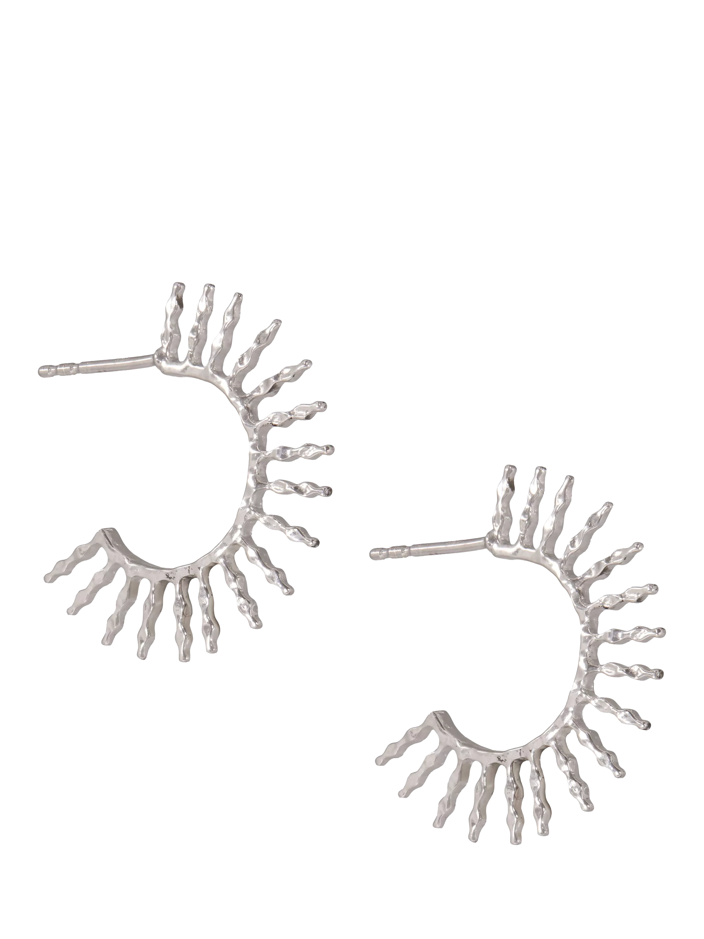 A classic Ottoman hands style in Sterling Silver. Reminding us of a petite sun, these small hoops have an eye-catching design. Handmade from recycled sterling silver, these boho earrings have been finished with a chic hand-hammered texture. Wear these sun earrings to brighten up a look. Ear posts are secured with a butterfly clasp. Suitable for pierced ears only.