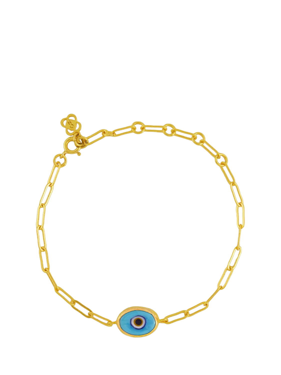 Protect yourself from negative energy with this handcrafted 21ct gold-plated bracelet featuring a vibrant blue evil eye and chain detail. Inspired by the colours of the Californian sky, this evil eye bracelet is perfect for layering.