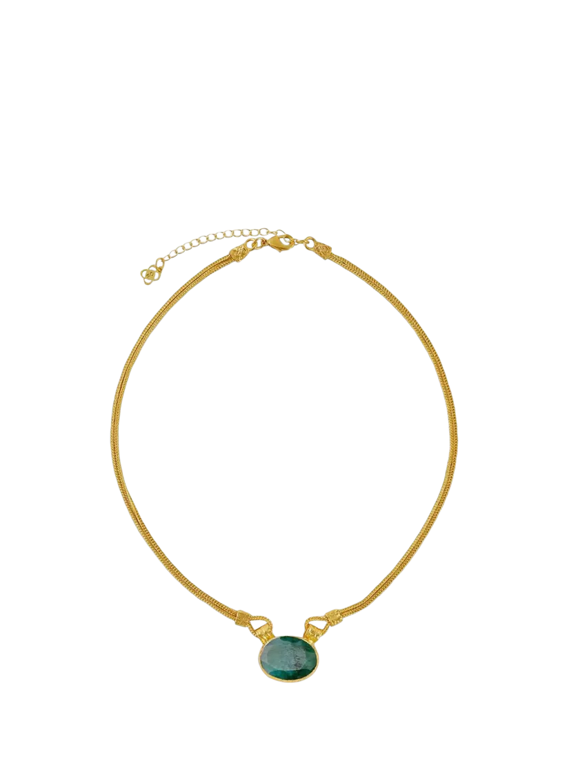 The Daphne Emerald Necklace is handcrafted with 21ct gold-plated recycled brass and set with an oval-shaped emerald gemstone threaded through a double chain design. This vintage-inspired design will bring old world glamour to your everyday style.