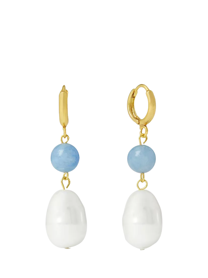 Handcrafted with 21ct gold plated recycled brass, these huggie hoop earrings are threaded with natural pearls and blue chalcedony semi-precious stones. The drop design is perfect for ear stacking. Secured at the back with snap fastening, and suitable for pierced ears only.