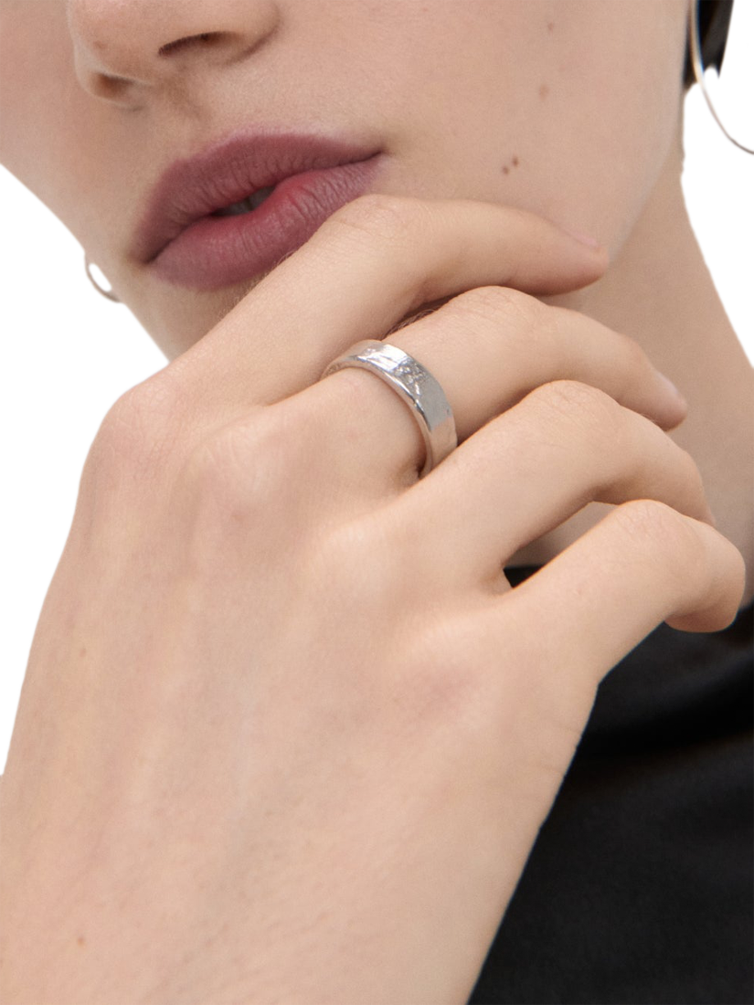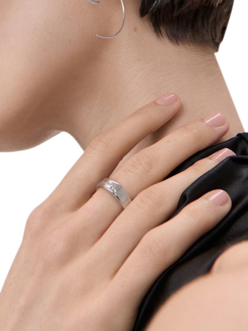 This beautifully handcrafted ring is a simple recycled sterling silver band with a little something extra. The thicker width and unique surface make it a subtle yet eye-catching piece and refreshing alternative to the classic version, making it a great addition to this season's wardrobe. Adjustable for the perfect fit.