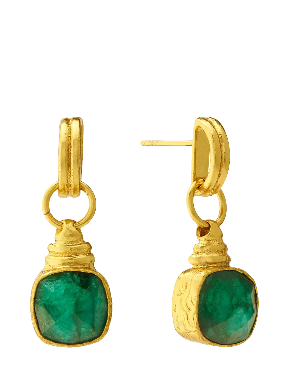 Crafted in a short-drop design, these chic stud earrings are created with 21ct gold-plated recycled brass and set with vibrant emerald semi-precious stones. Designed to make a gemstone impact, this gold pair would make a perfect birthday gift. Secured at the back with a butterfly clasp and suitable for pierced ears only.