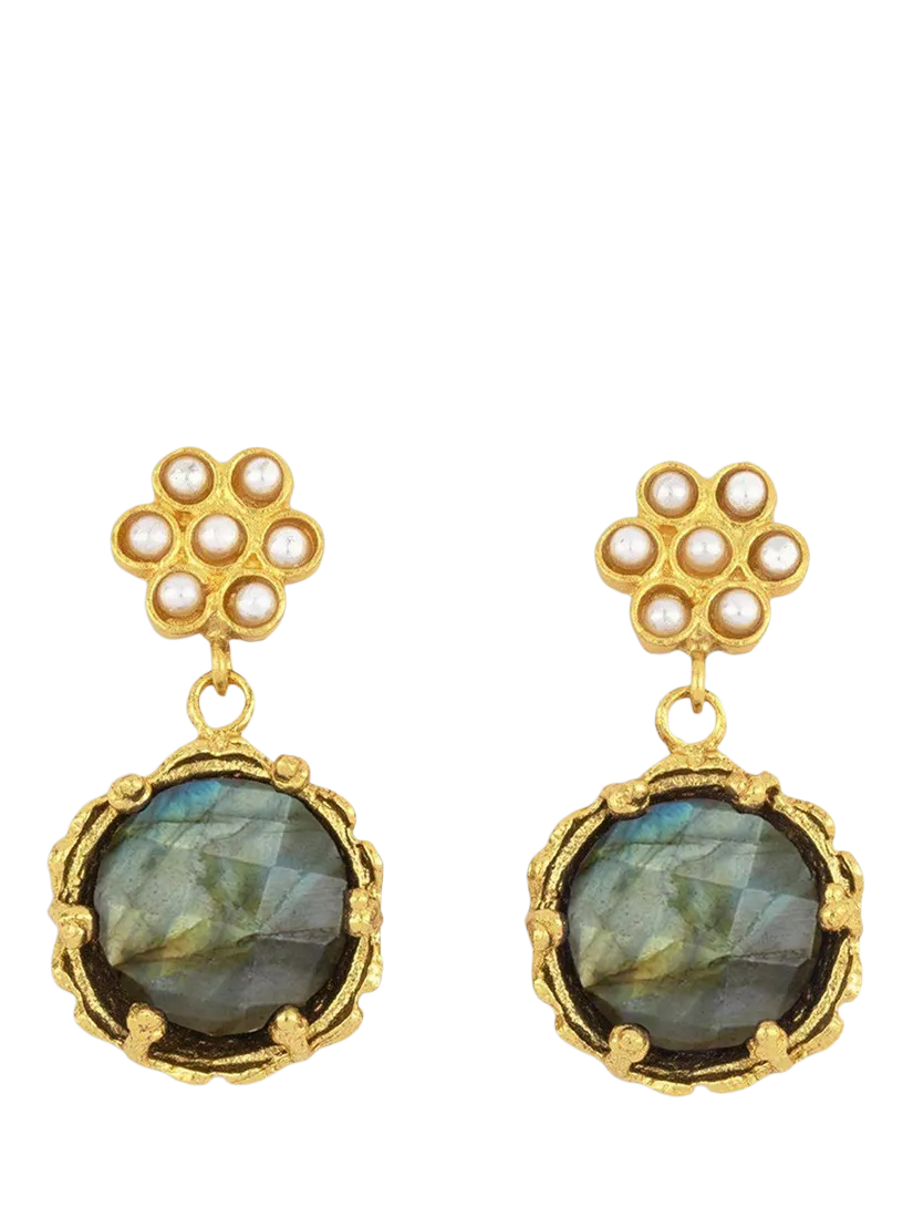 These flower drop earrings offer everyday elegance with their unique combination of pearl and labradorite gems. Handmade in 21ct gold plating, they are secured with a butterfly back and suitable for pierced ears only.