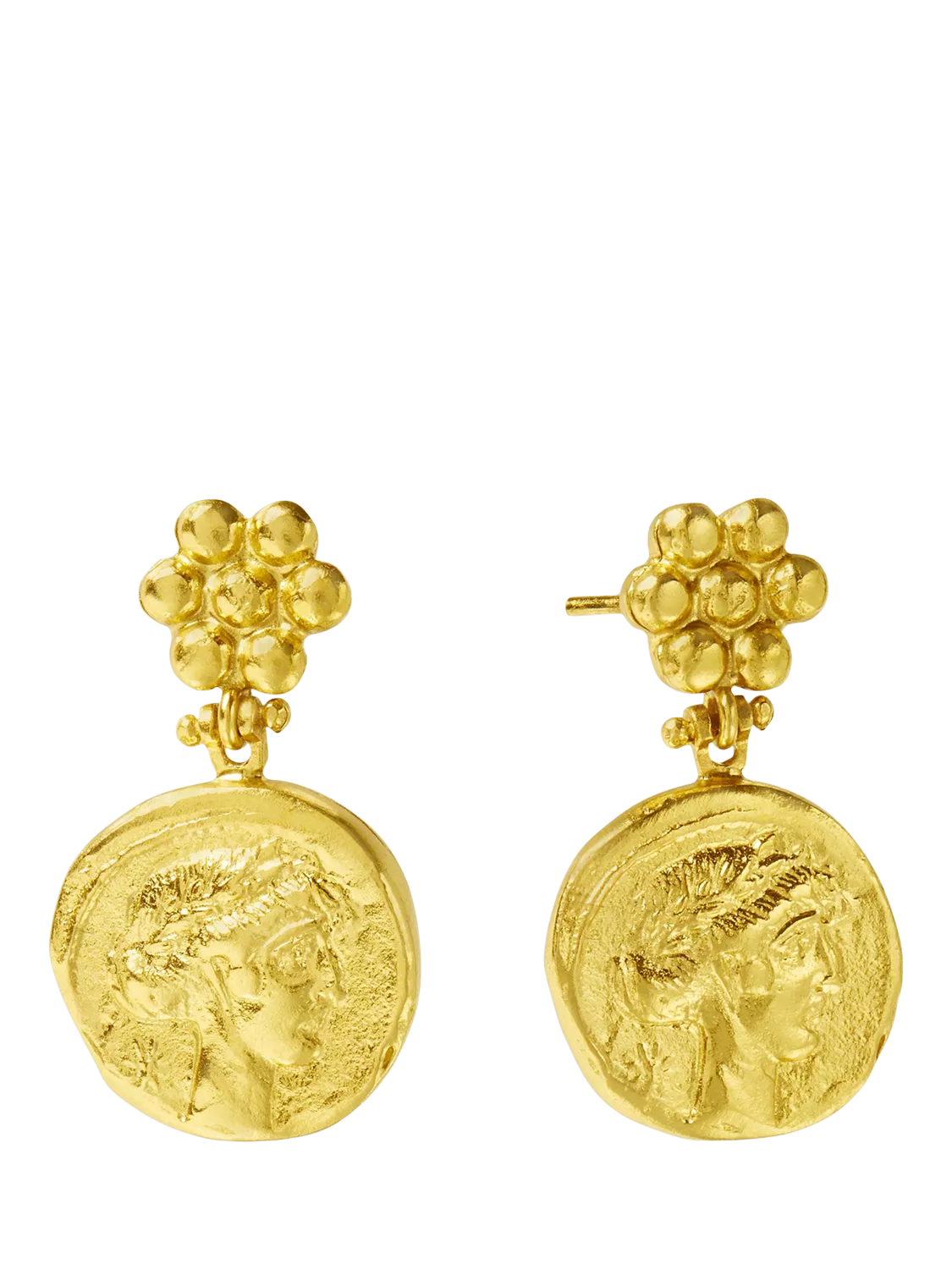 Inspired from Greek Mythology and powerful female figures, the Goddess Demeter Coin Drop Earrings are held by flower-shaped beads, adding timeless elegance to these handmade coin earrings. Crafted in 21ct gold-plated recycled brass, with the ear posts plated on sterling silver. Secured with a butterfly clasp, they are suitable for pierced ears only.