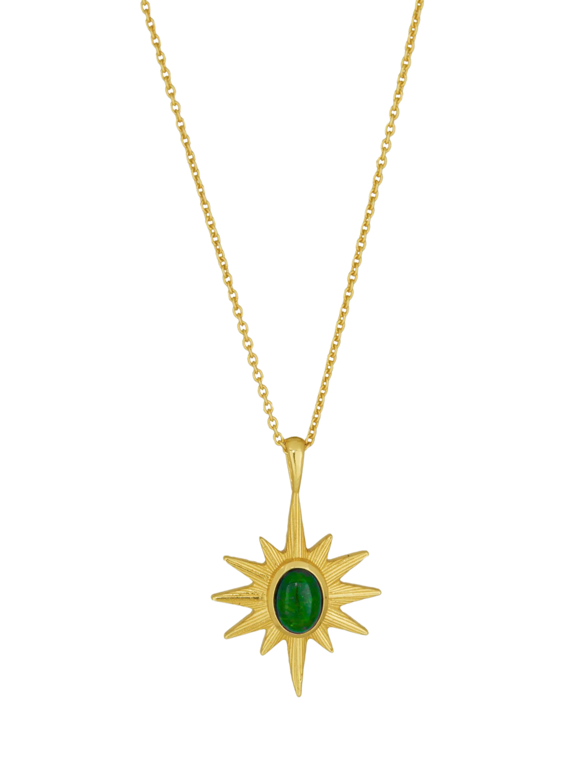 This striking necklace is made from 18ct gold-plated recycled brass and features a green onyx star, a stone associated with healing, clarity and emotional balance. The rich colour and symbolic shape make it perfect for grounding energy and elevating style.