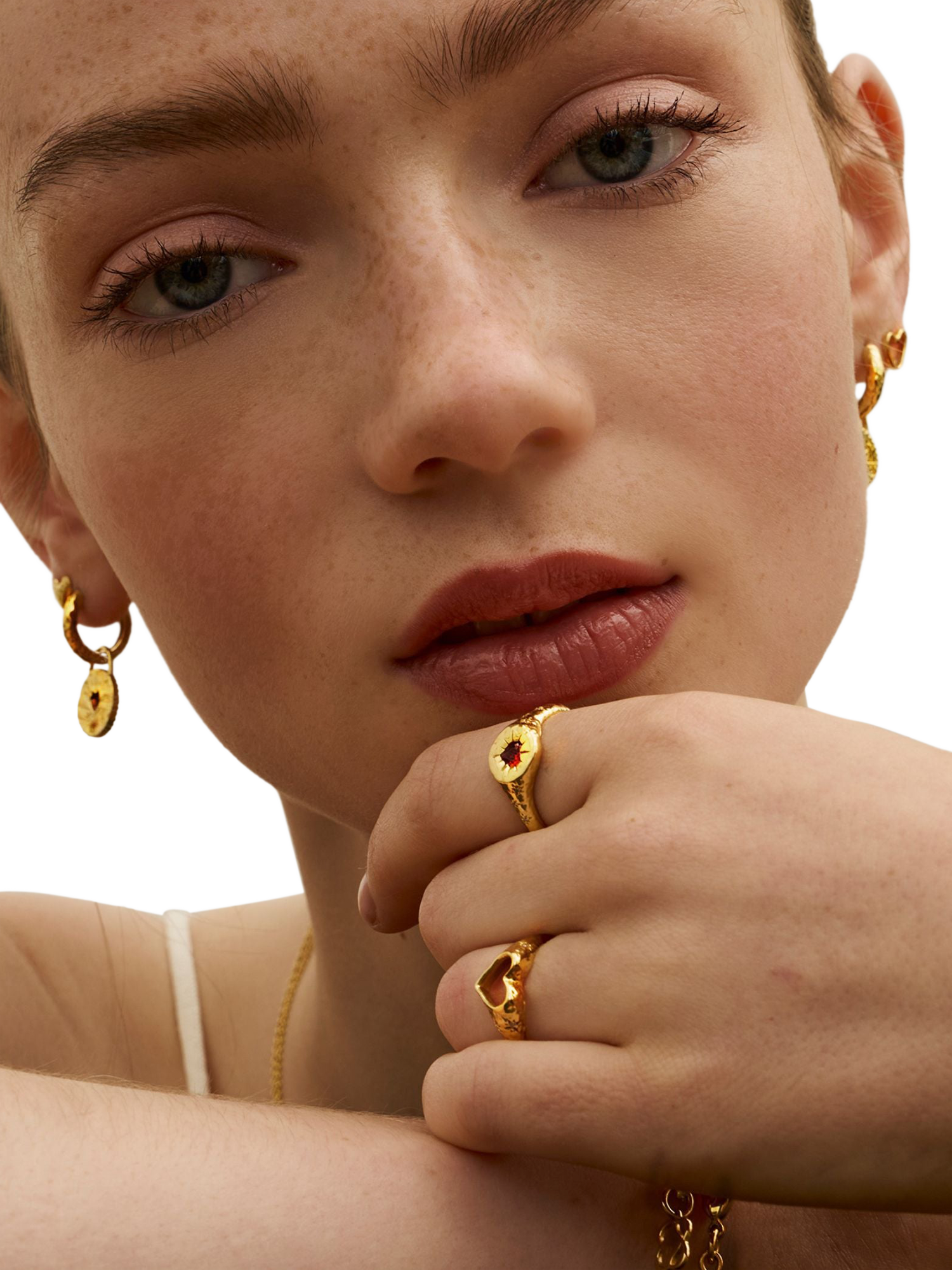 This 18ct gold-plated recycled brass ring showcases a rich red garnet in a heart-shaped setting, a stone symbolising passion, devotion and protection. A bold pop of colour with meaning, perfect for romantic gifting or personal keepsakes.