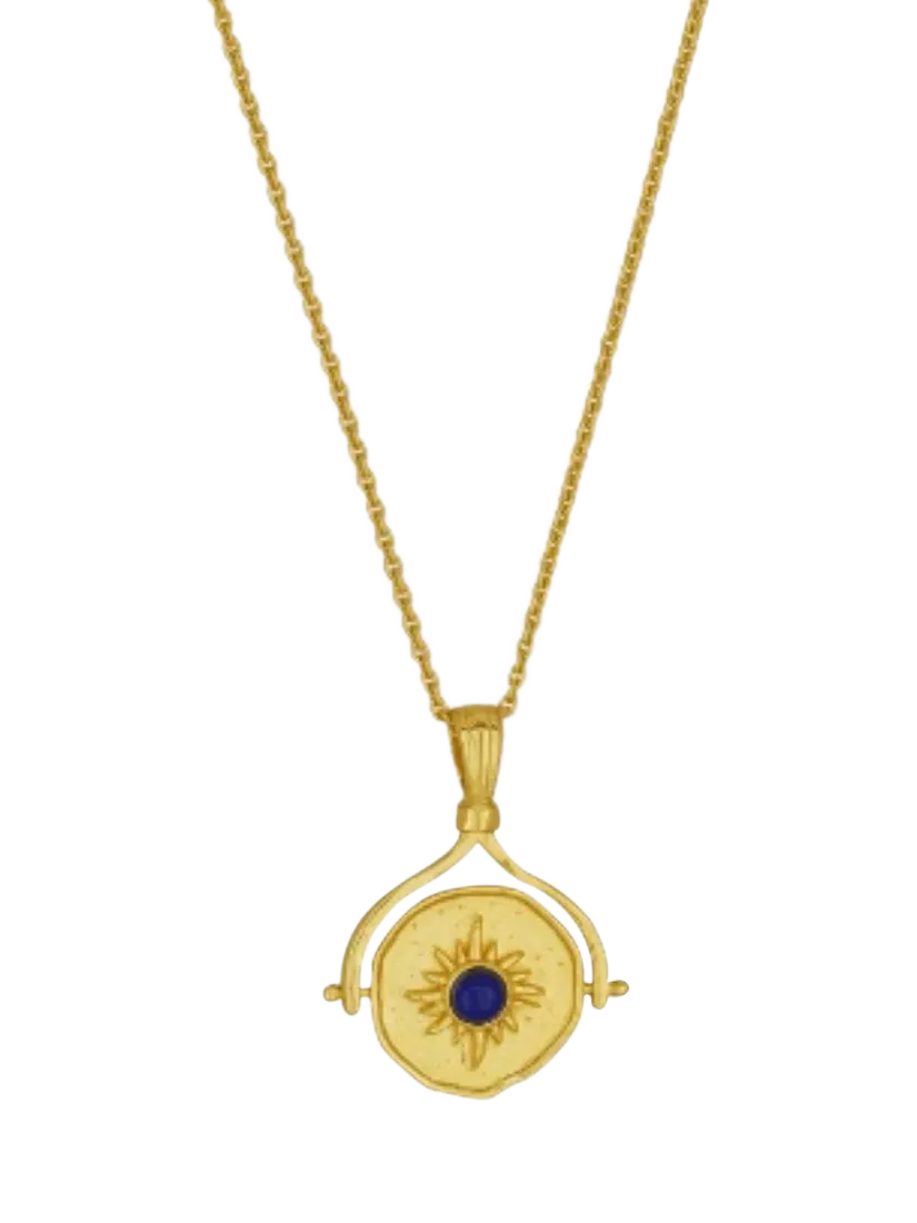 This celestial necklace features a rotating lapis sun setting and crescent moon setting. Lapis lazuli is believed to awaken inner wisdom and confidence. The kinetic design brings movement and depth, making it a unique and empowering piece.