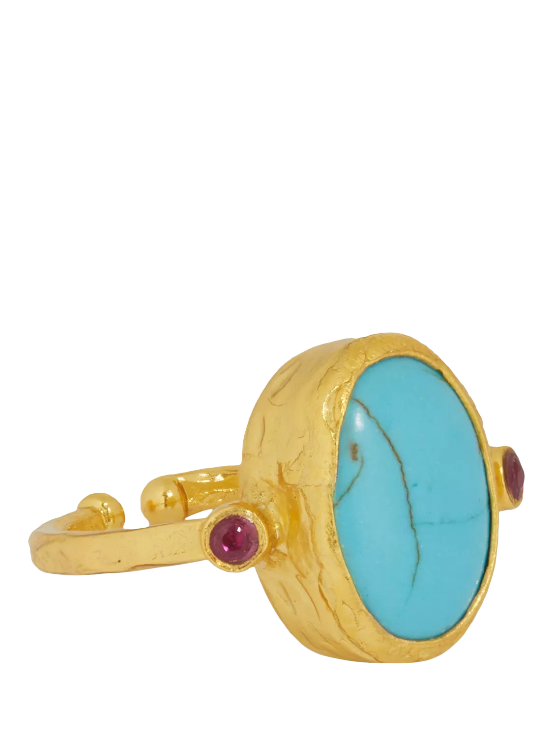 Adjustable for a perfect fit, this cocktail ring is handmade with an oval shaped Turquoise stone and two petite red crystals for a touch of extra colour. Easy to wear and style, this gold ring is perfect for adding a gemstone sparkle to your ring stack.