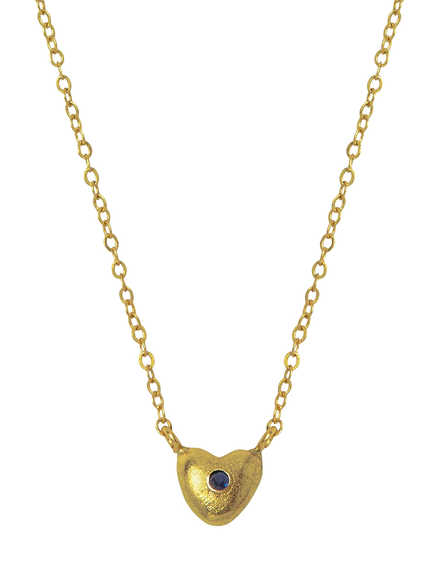 Strung on a delicate 21ct gold-plated chain, this petite heart shaped pendant is hand-set with a blue cubic zirconia gemstone in the centre, perfect as a gift to a special someone. Crafted from 21ct gold plated on recycled brass.