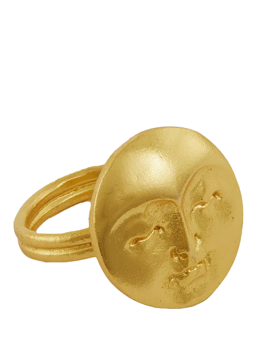 Embrace your love for the night sky with the Moon Face ring. Perfect for moon lovers, this versatile ring is handmade with 21ct gold-plated recycled brass, and its adjustable band ensures a comfortable fit to stack and style the way you like.