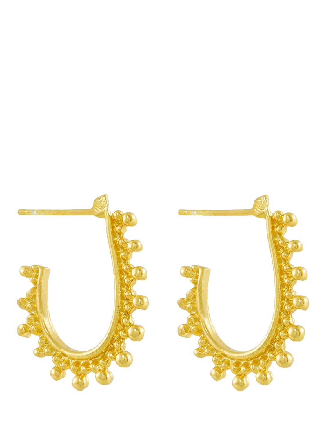 Add a touch of charm with the Raisa Hoop Earrings. These playful hoops, handcrafted from 21ct gold plated recycled brass, feature a unique design that's perfect for styling any look, whatever the occasion. The ear posts are gold-plated on sterling silver and secured at the back with a butterfly clasp. Suitable for pierced ears only.