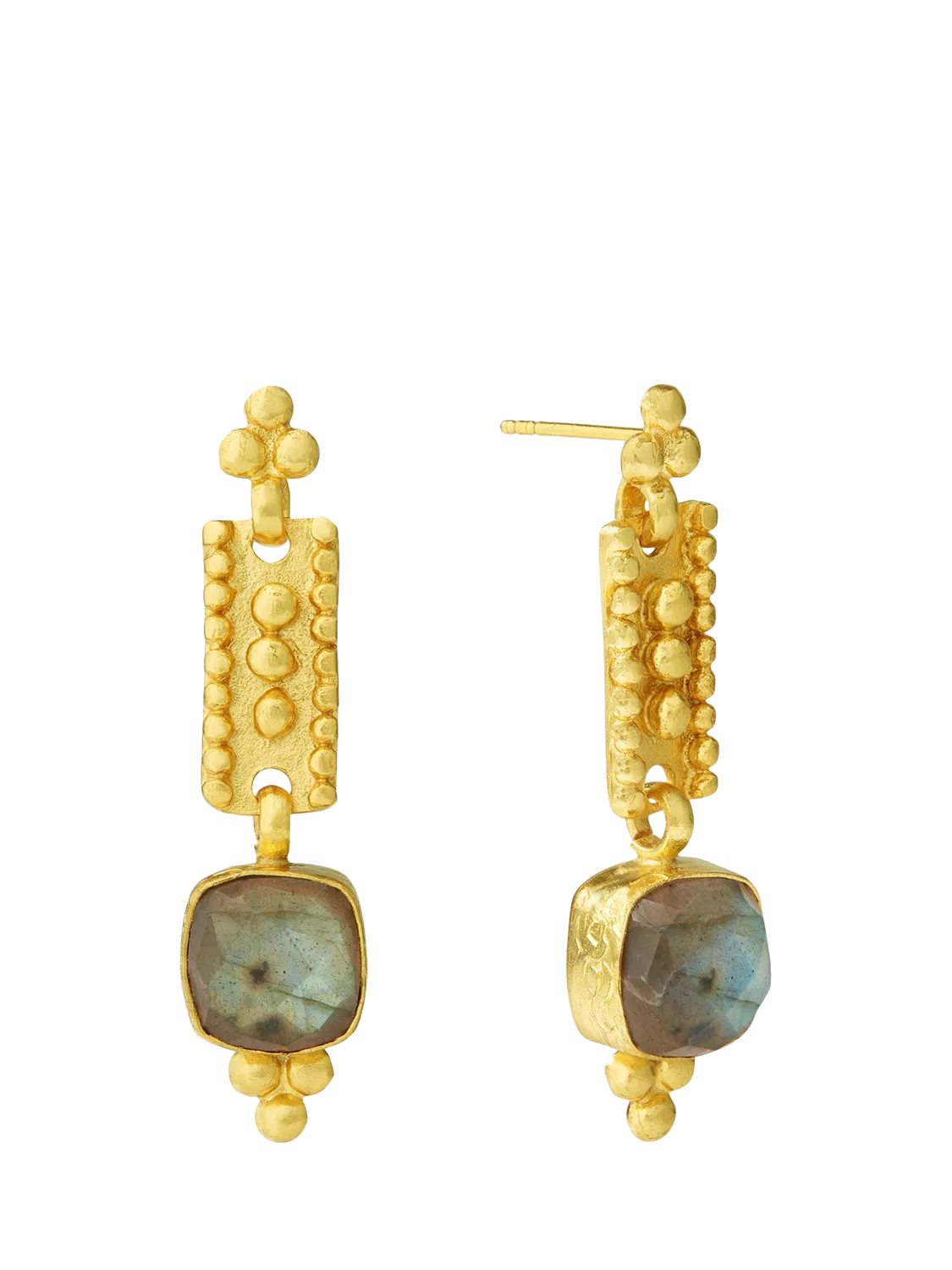 Featuring a rectangle drop design, these handmade earrings have been hand-set with a lustrous labradorite gemstone. Plated with 21ct gold recycled brass, these gemstone earrings feature gold bead detailing for that unique antique feel. Ear posts are plated on sterling silver, and secured at the back with a butterfly clasp. Suitable for pierced ears only.