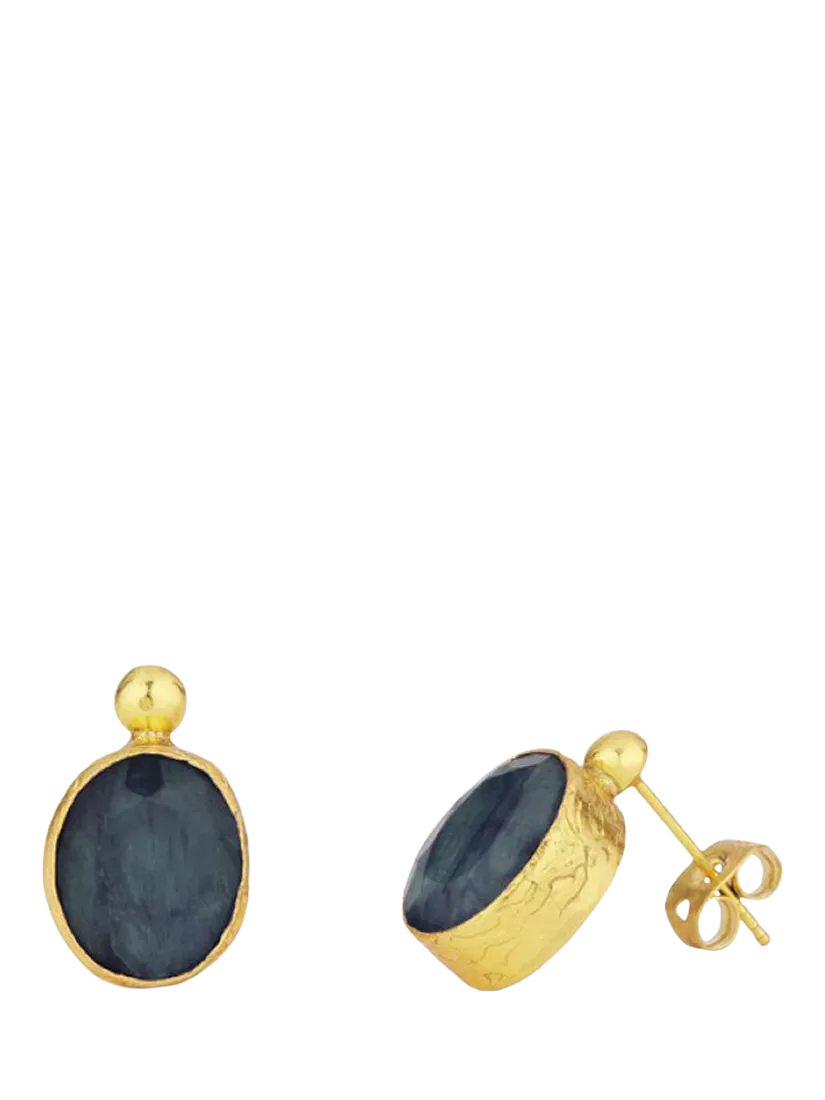 These plated studs are hand-set with deep Labradorite semi-precious stones. The stones are set in textured metal and are perfect for adding a pop of colour to your look.