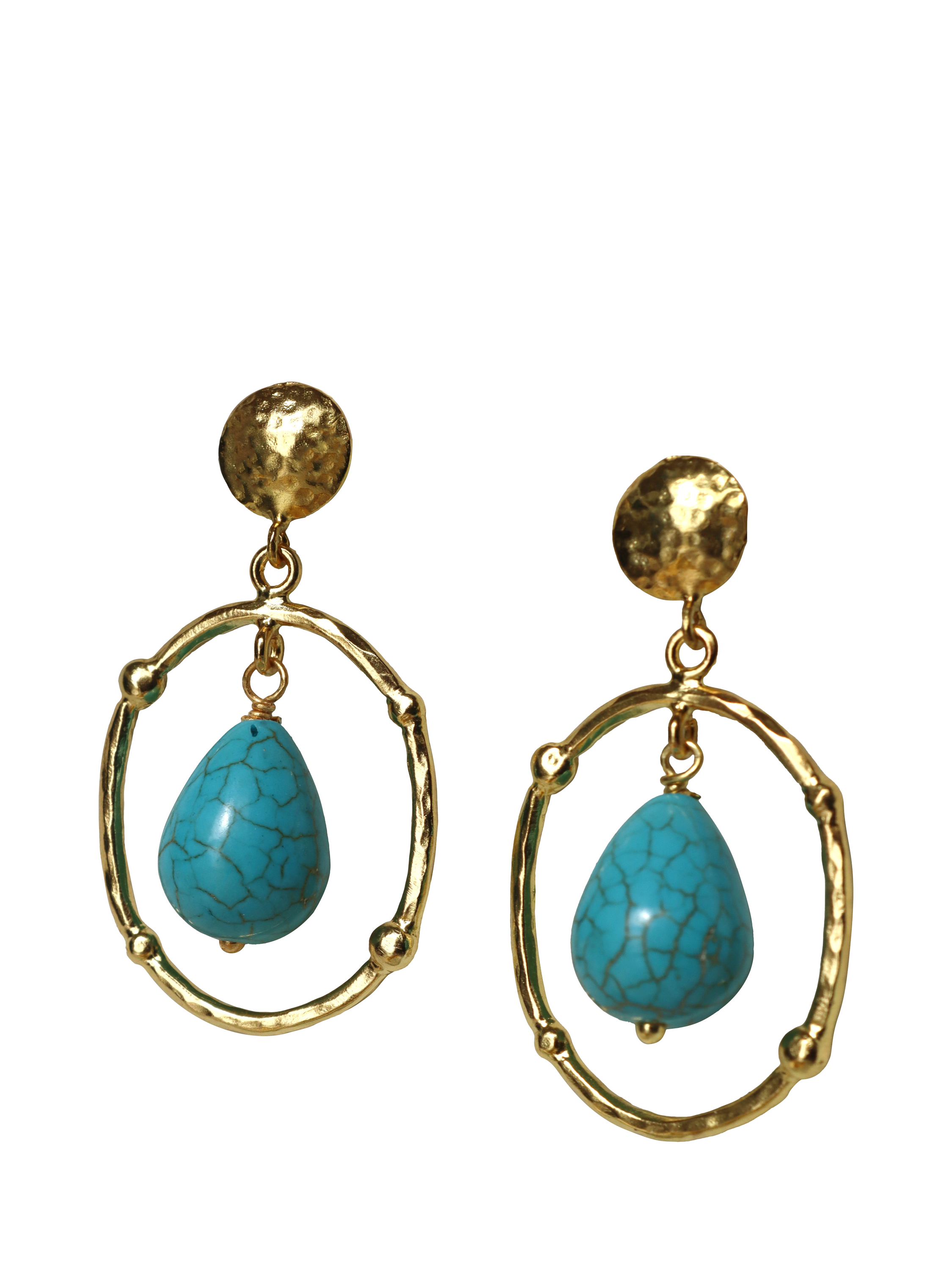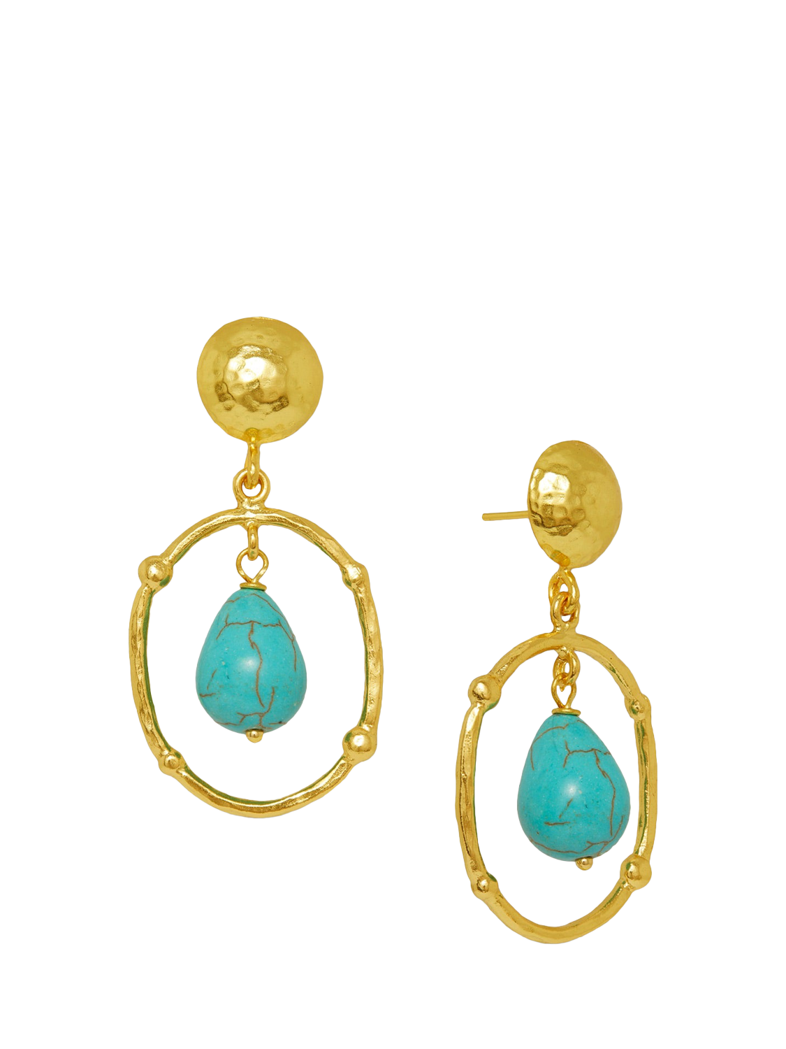 The Sloane Turquoise Drop Stud Earrings embody a refined coastal elegance, featuring a striking semi-precious Turquoise stone pendant delicately suspended within a textured golden ring. Handcrafted with care from 21ct gold-plated recycled brass, these earrings combine the natural beauty of Turquoise with warm golden hues for a sophisticated yet relaxed look. Suitable for pierced ears only.