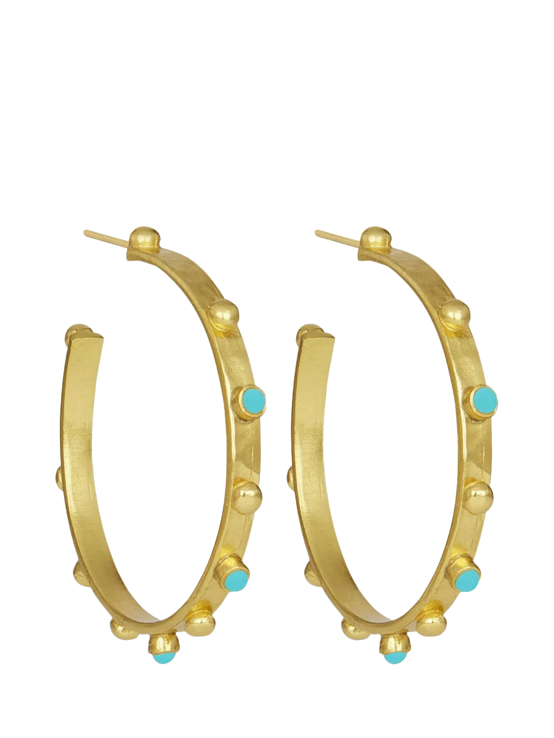 A unique blend of high quality plating and handcrafted details, these large hoop earrings are set with turquoise beads and granulation for added character and will bring a statement touch to your everyday looks. Ear posts are plated on sterling silver. Secured at the back with a butterfly clasp, they are suitable for pierced ears only.