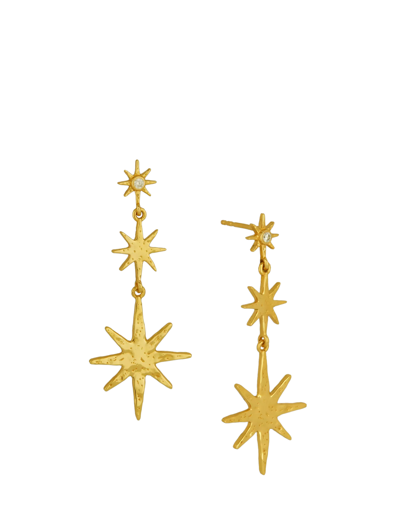 These 18ct gold-plated recycled brass earrings feature three cascading stars, the first set with twinkling white cubic zirconia. Symbolising dreams, direction and destiny, they create gentle movement and subtle sparkle. A must-have for cosmic charm with a modern feel. Suitable for pierced ears only.