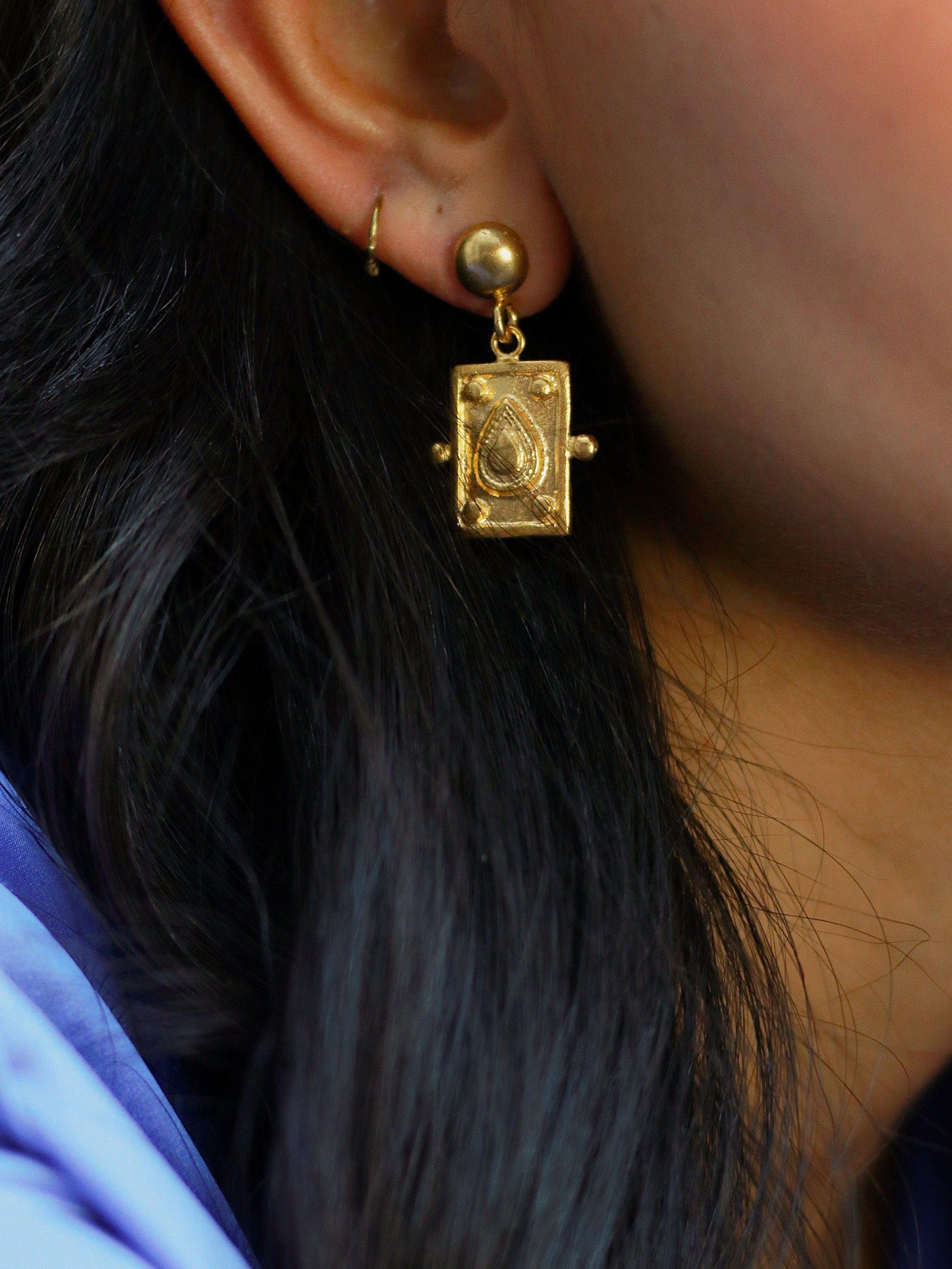 These chic drop earrings are reminiscent of vintage cards. Handmade by artisans in Istanbul, these gold-plated earrings are perfect for adding a touch of romance and character to your looks. The ear posts are plated on sterling silver, and secured at the back with a butterfly clasp. Suitable for pierced ears only.