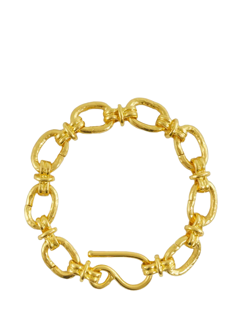 Inspired by timeless antique designs that have never go out of fashion, the Zehra Chain Bracelet features bold gold links and finished with a hammered texture and can be adjusted to fit you best. The Zehra bracelet is handcrafted sustainably at the brand's Istanbul workshop from 21ct gold-plated recycled brass.