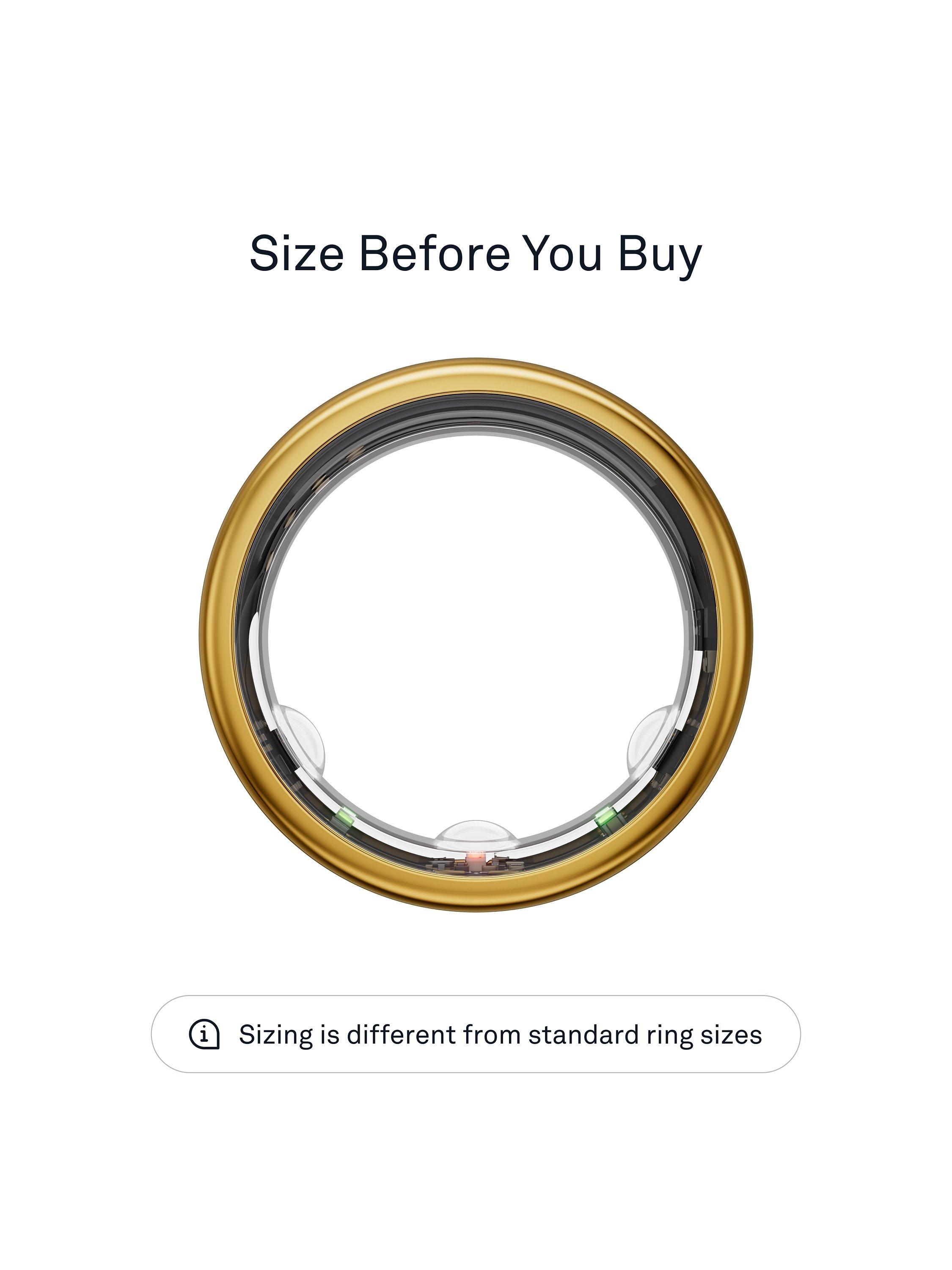 IMPORTANT: Size yourself with the Oura Ring Sizing Kit before you buy. Oura Rings are not standard sizing, and finding the right size will result in the best experience possible. With a sizing kit purchase, you will receive a £10 coupon code to use towards your Oura Ring at checkout.
