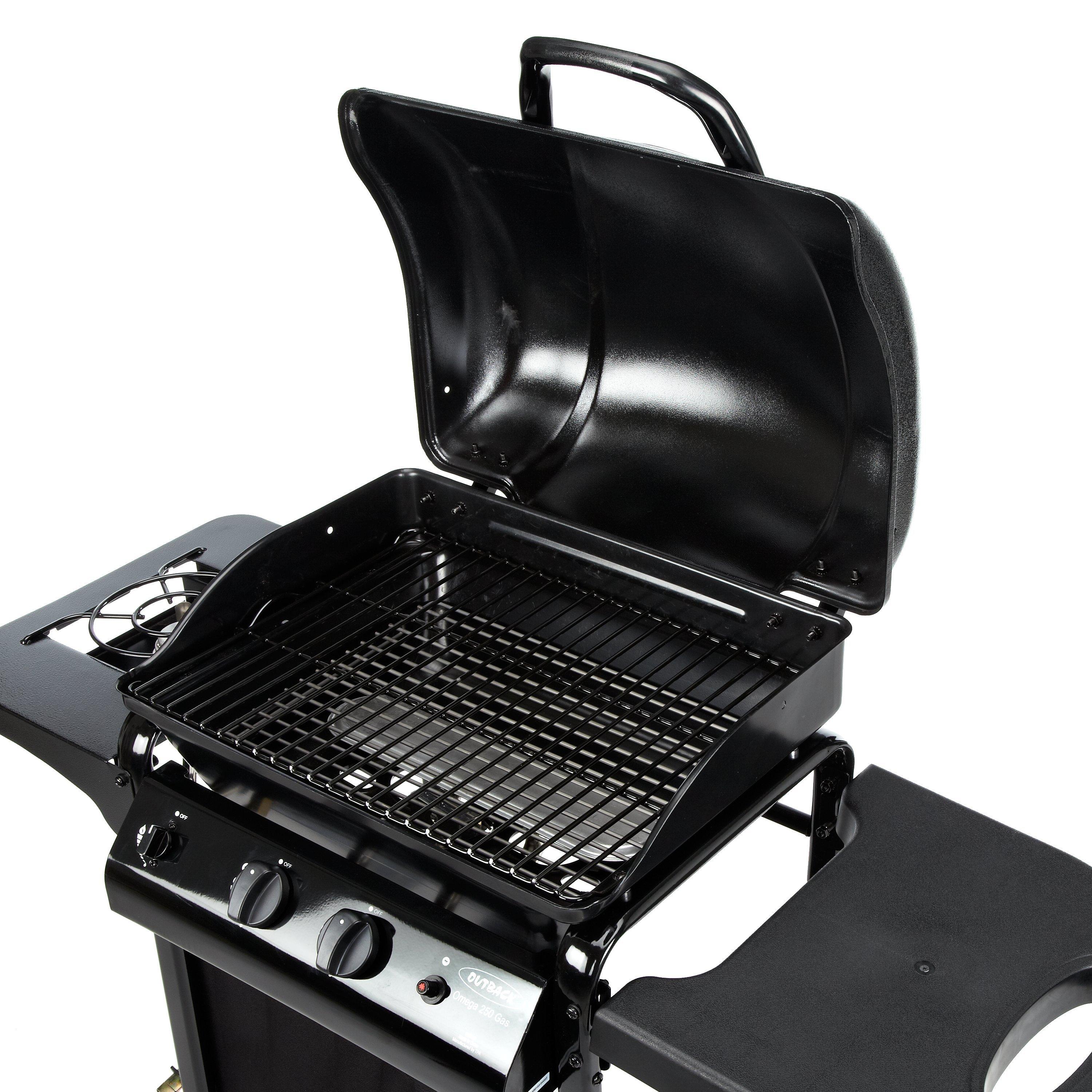 Aluminised burners — easily controlled by two knobs on the front panel — make cooking an effortless experience. Along with a handy serving shelf, the barbecue has two rubber wheels for portability and a removable nylon screen over the front of the cart.