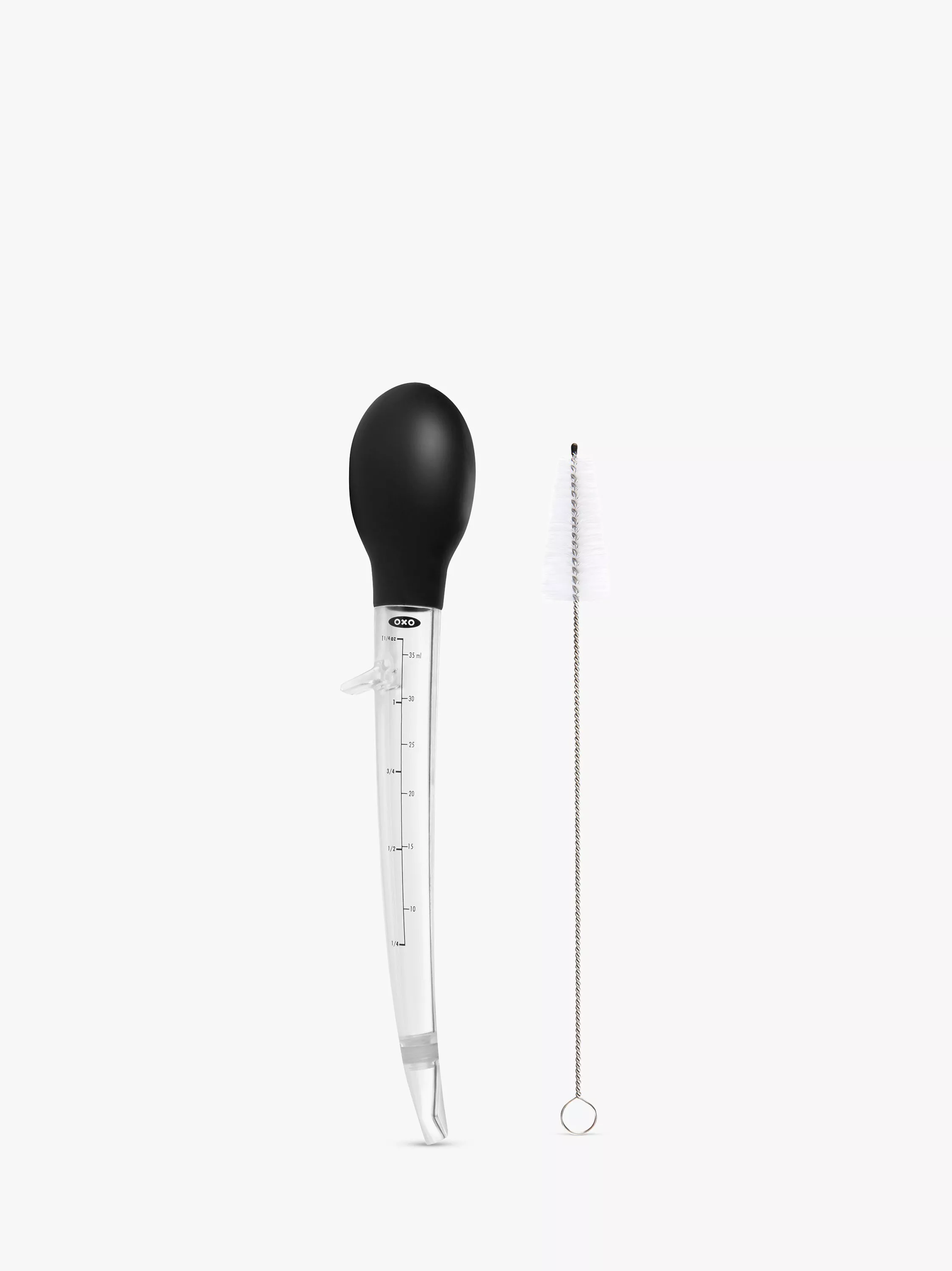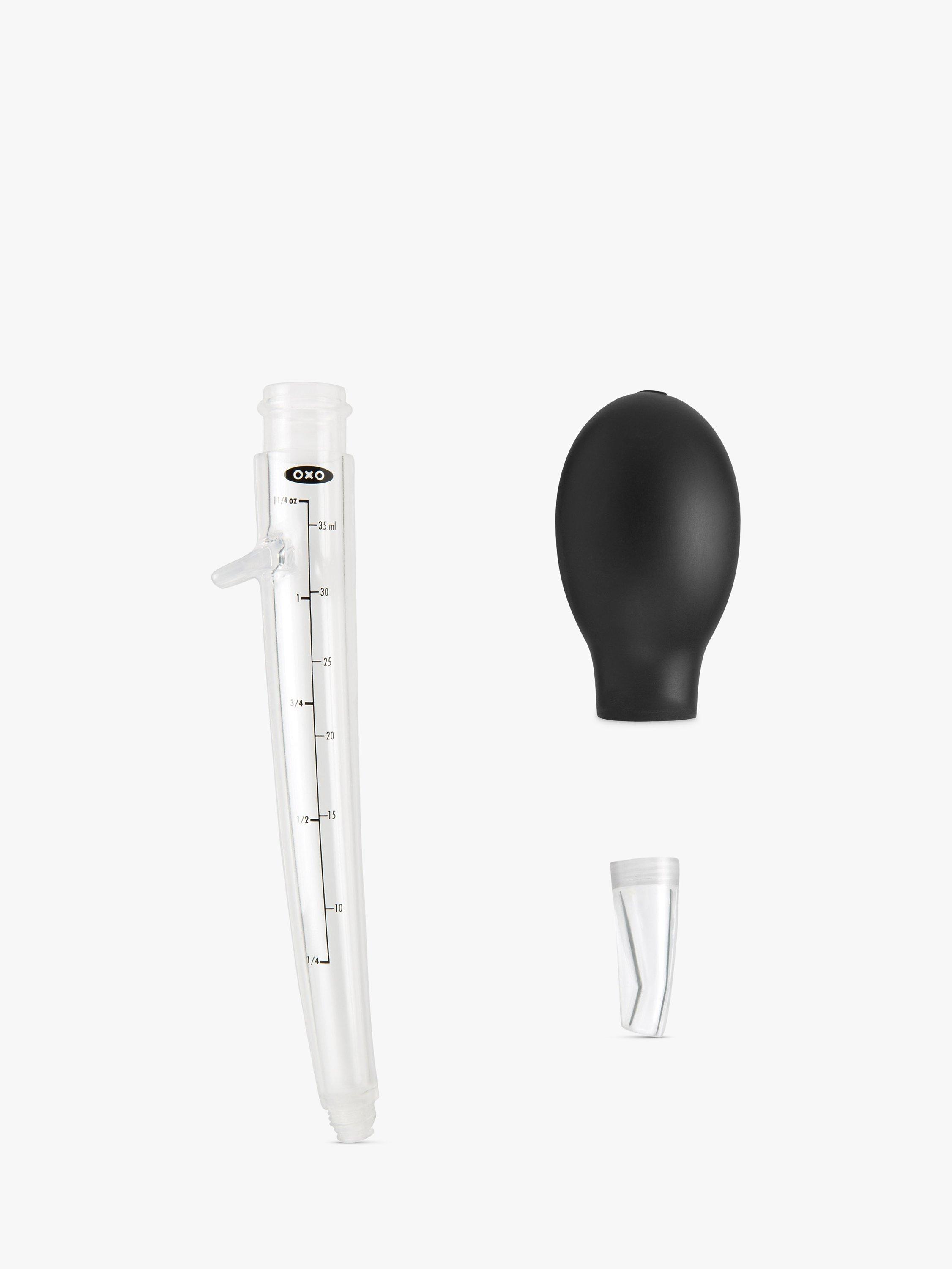 The round, silicone bulb is comfortable to hold and squeeze at any angle, and the measurement markings are clear.The angled baster has an integrated stand to keep it from rolling around on the kitchen counter and minimises drips. The baster bulb and tip are removable for easy cleaning with the included baster brush and all parts are top-rack dishwasher safe.