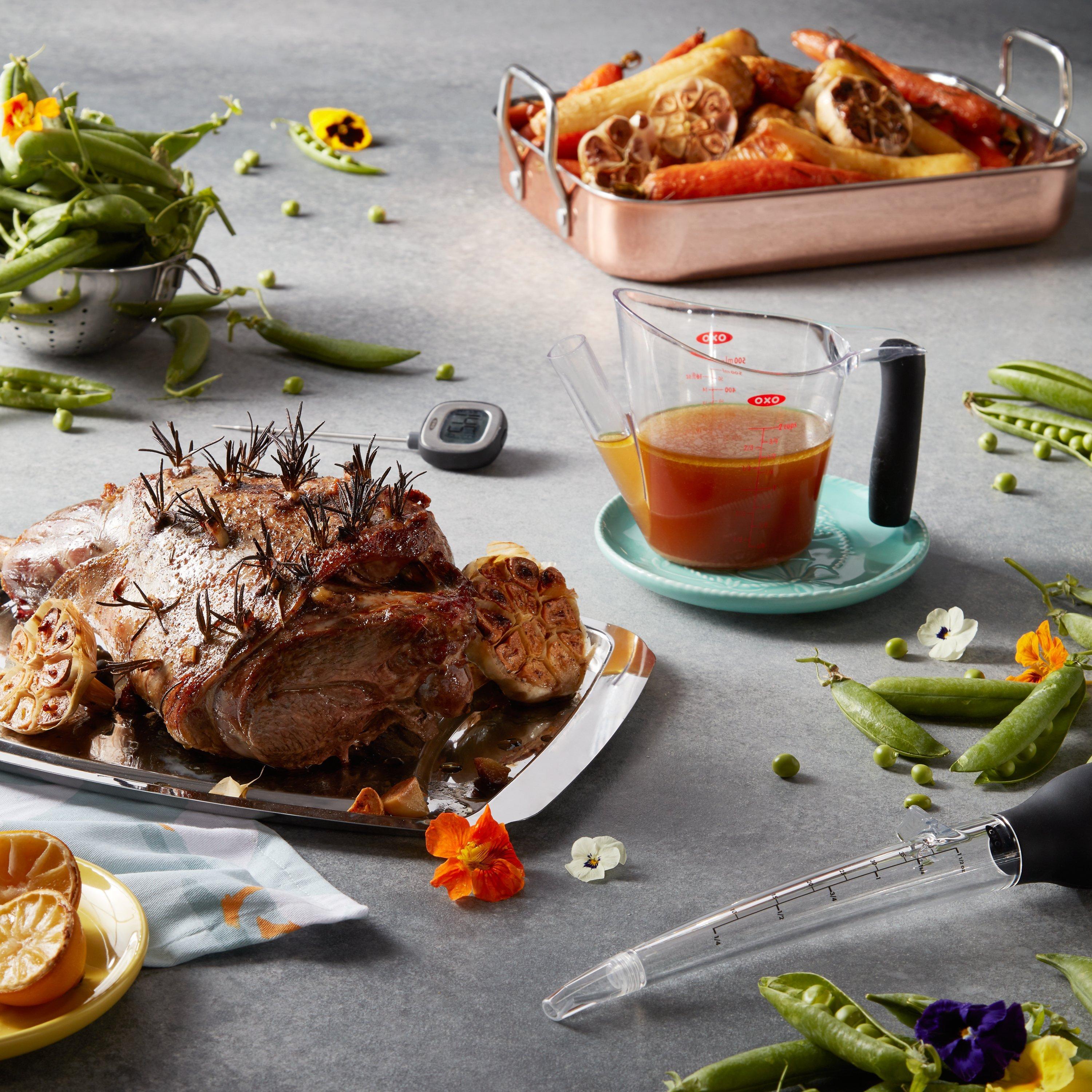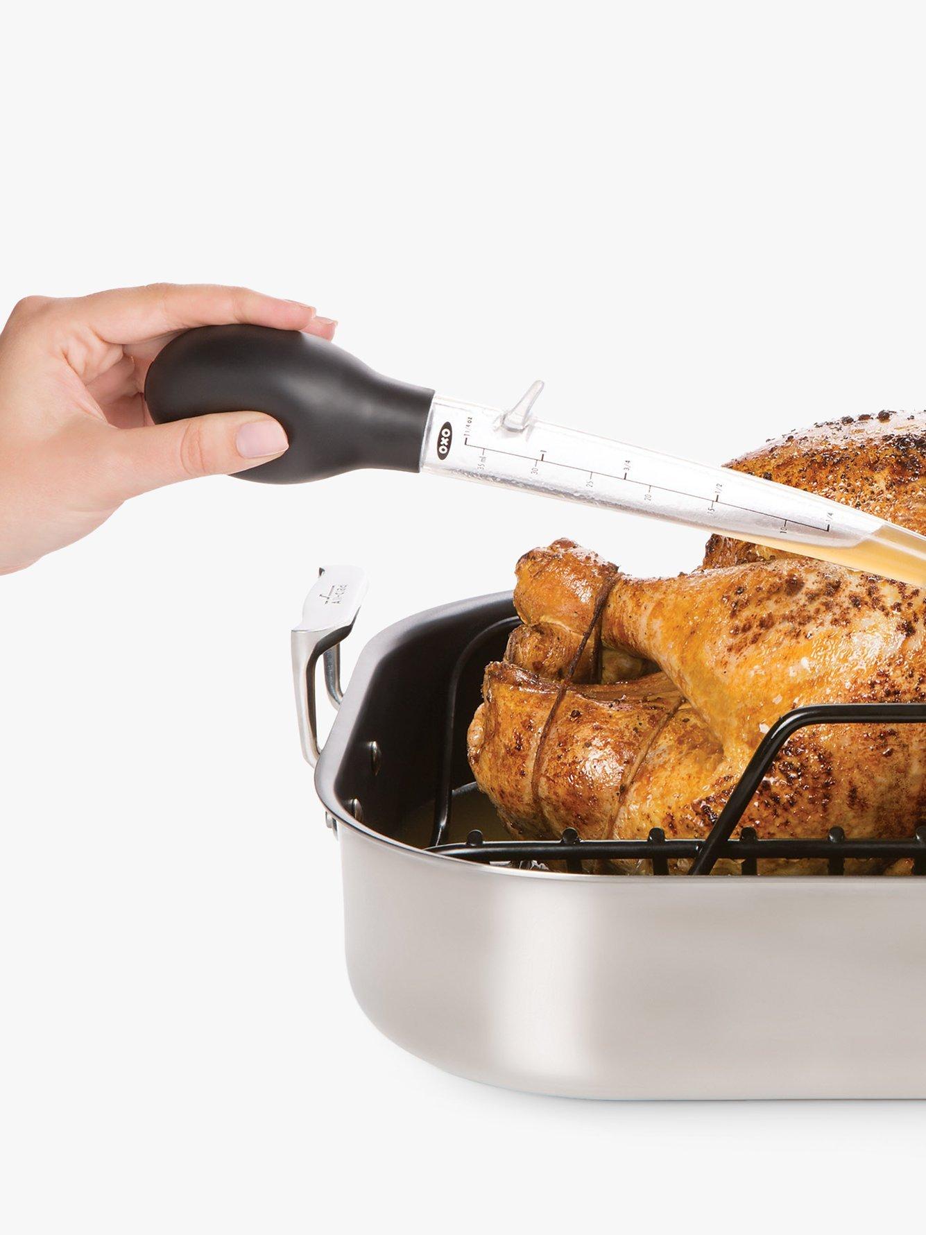 The OXO Good Grips Angled Baster makes it easy to baste poultry, including big birds. The angled tip reaches into pans and ovens without having your hands get too close.