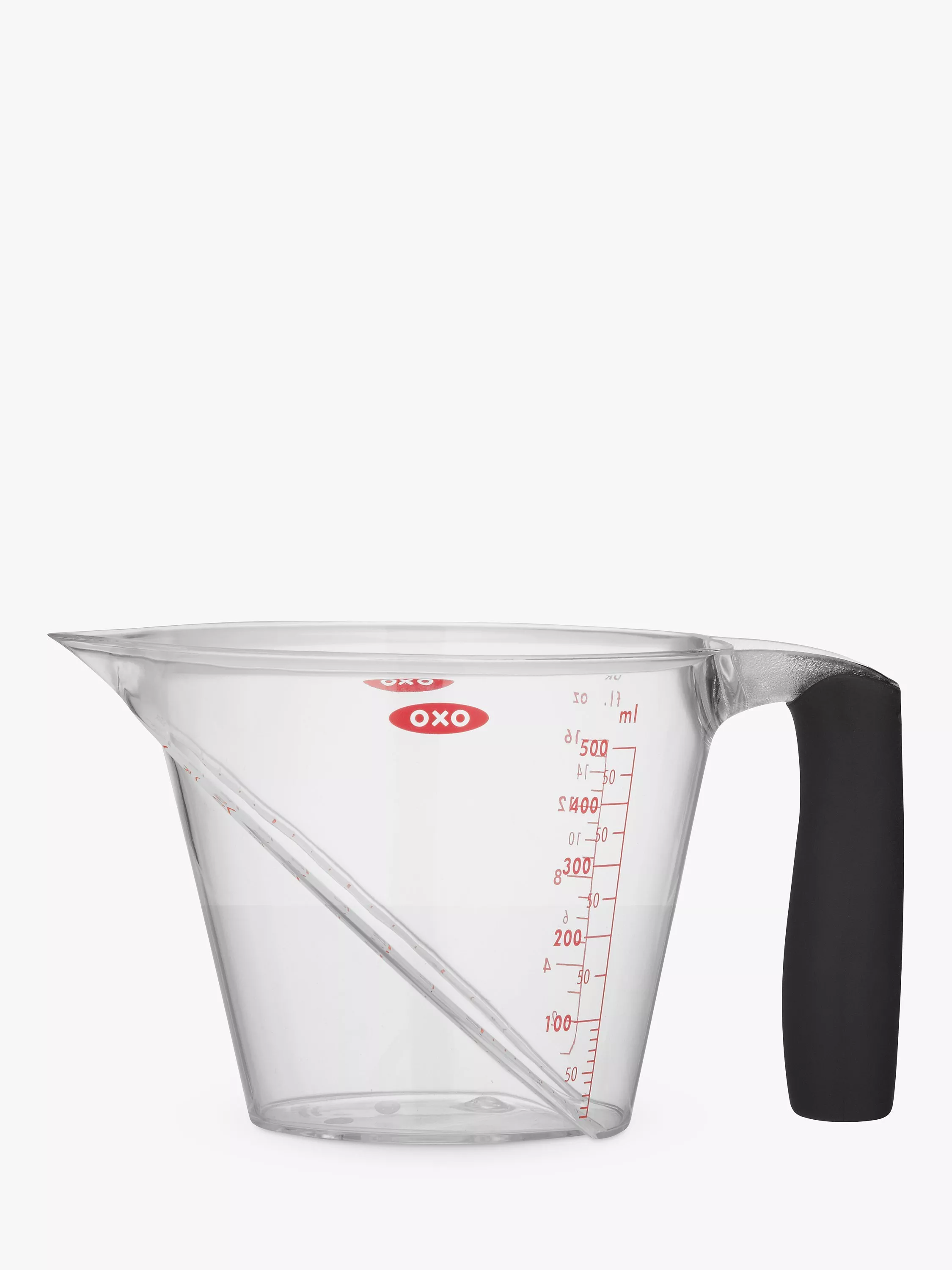 This OXO Good Grips measuring jug boasts a sleek design and an innovative angled surface that allows you to easily view measurement markings while pouring. This patented feature eliminates the need for awkward bending or lifting to eye level, enabling you to accurately measure ingredients as you pour them. The jug includes clear and precise markings for fluid ounces and millilitres.