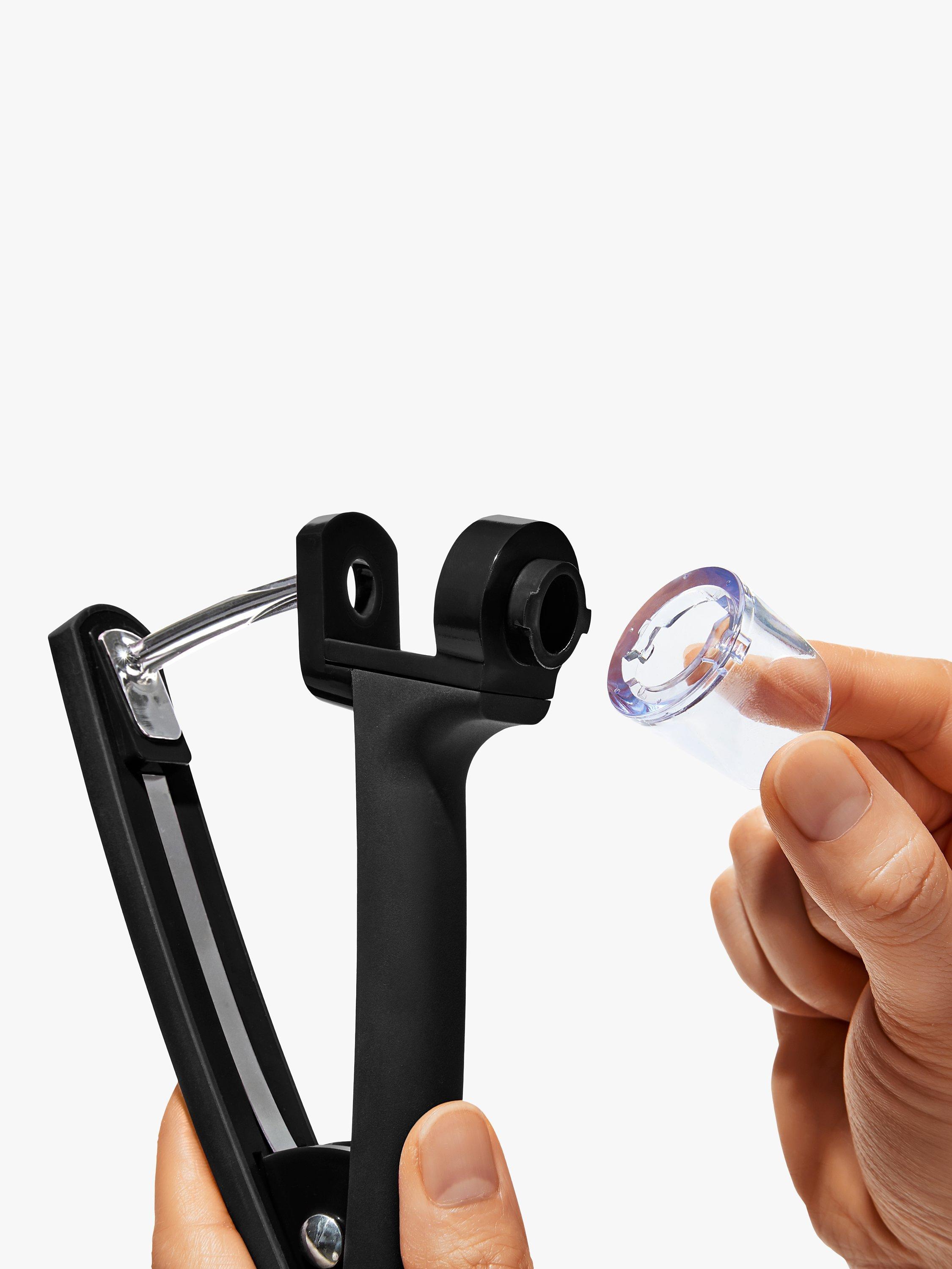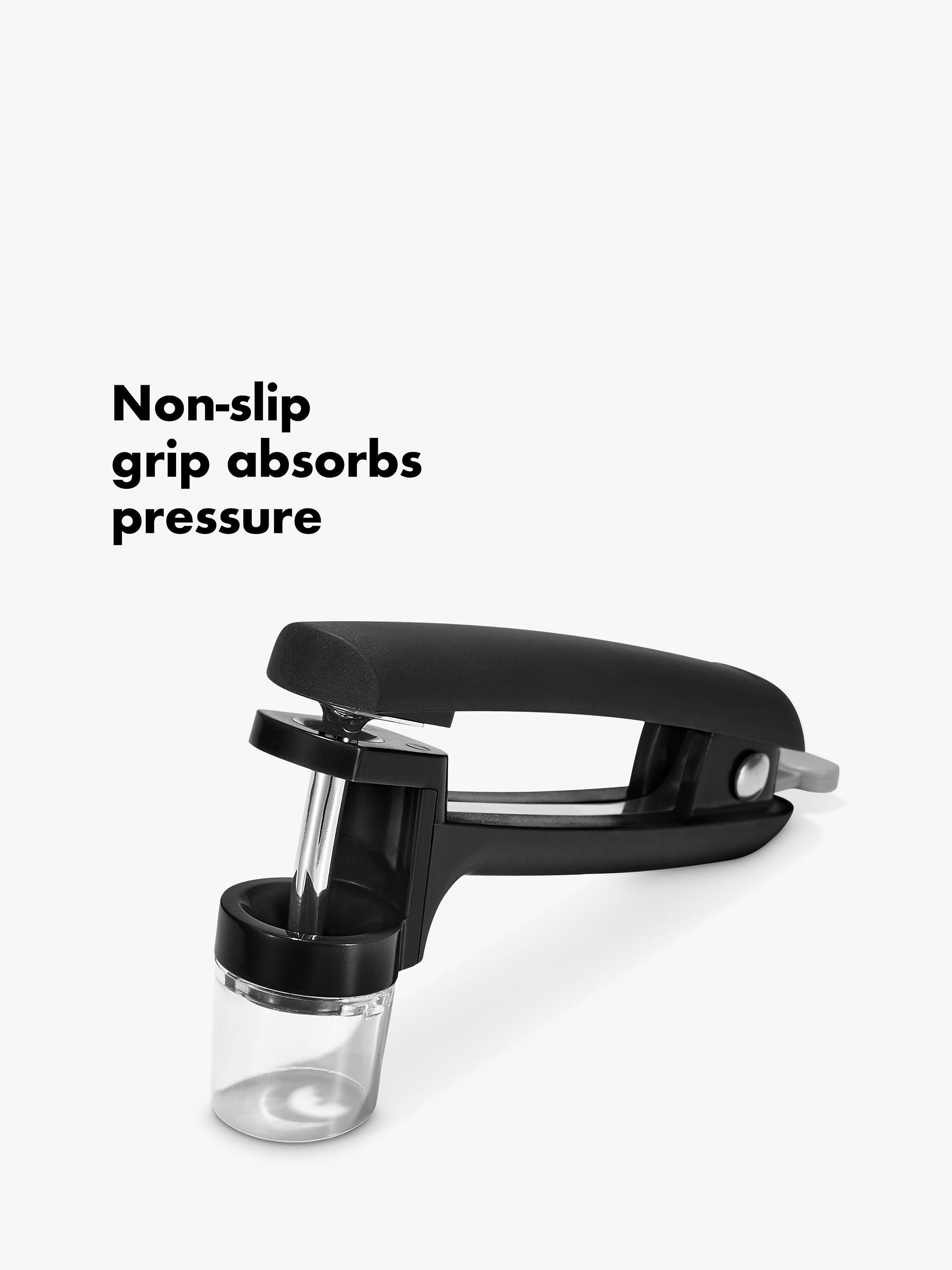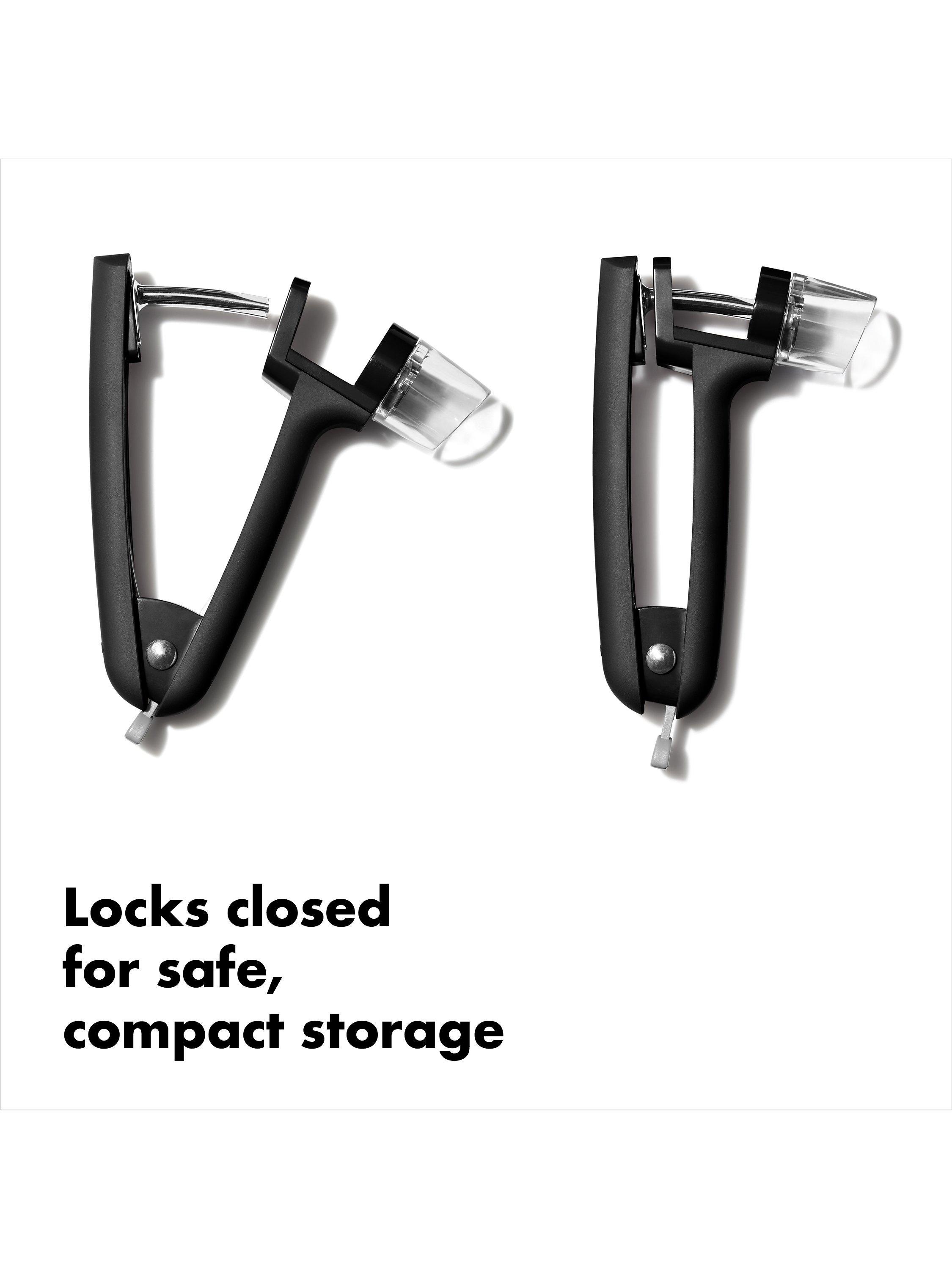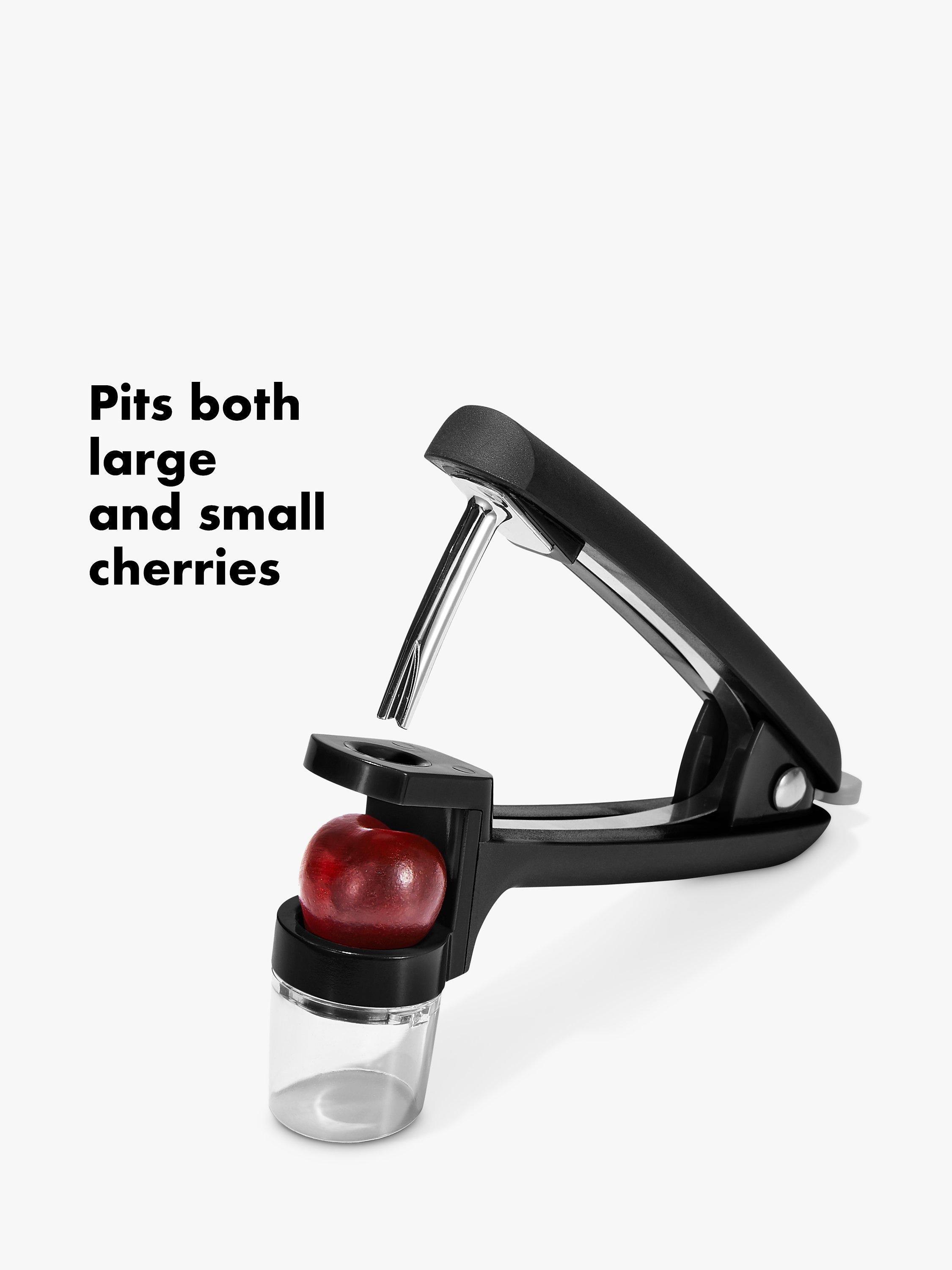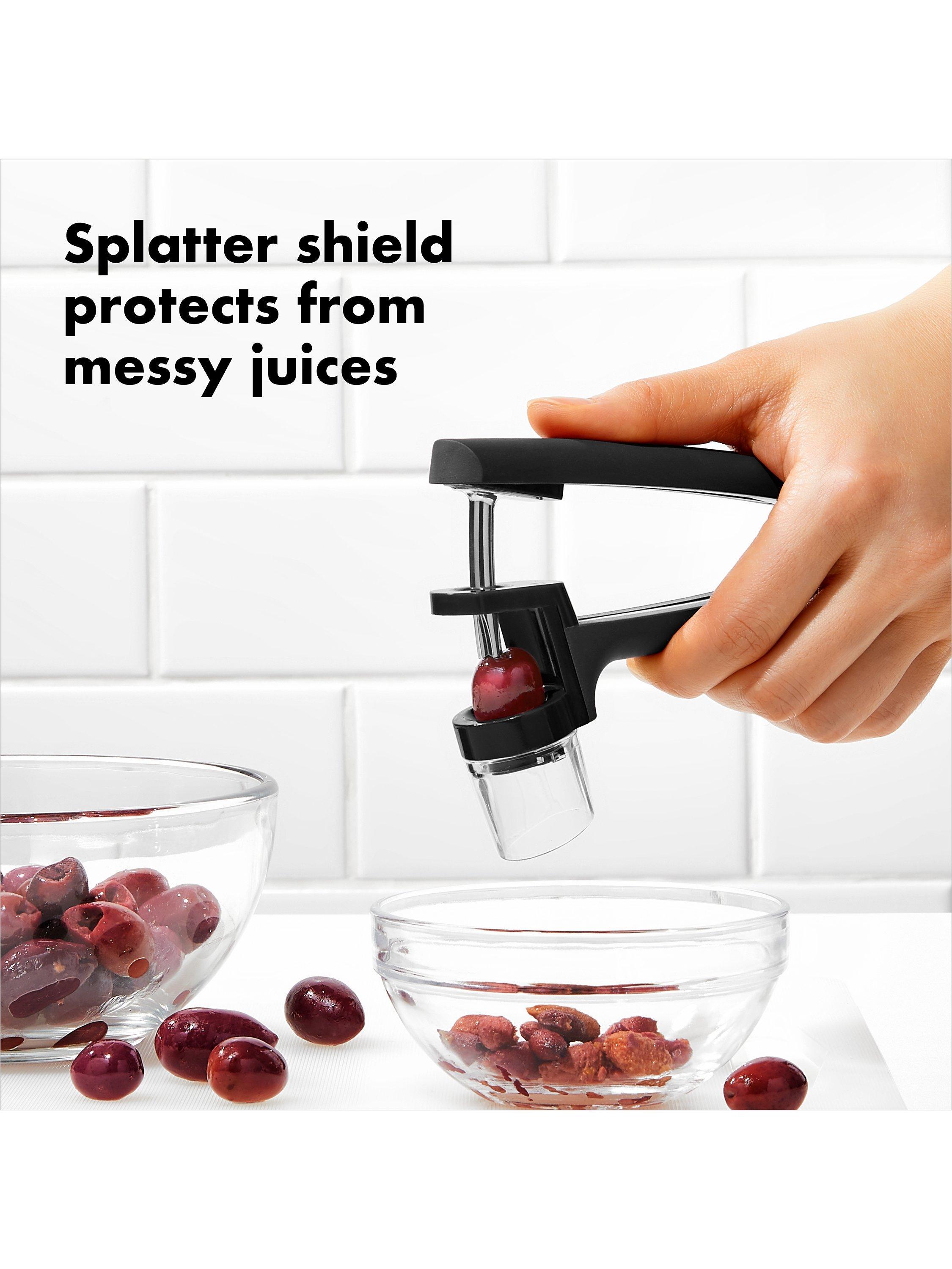 The OXO Good Grips Cherry and Olive Pitter has a pressure-absorbing, non-slip grip that makes pitting even a pie’s worth of fruit effortless. A splatter shield protects your work area and clothing from messy juices and removes for easy cleaning. Our sturdy, die-cast zinc pitter has a generous holder that accommodates large cherries like Bing and Rainier as well as a recessed design that secures smaller varieties of cherries and olives. The pitter locks closed for safe and compact storage. Dishwasher safe.